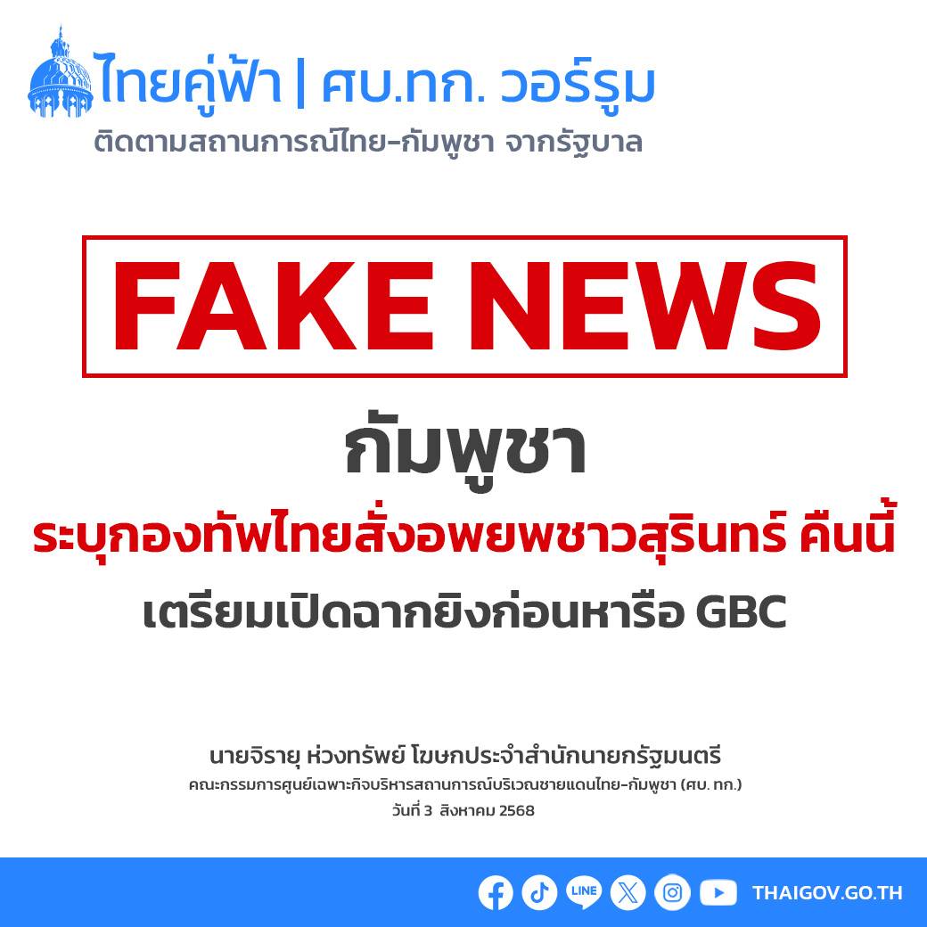 เมื่อเวลา 21.10 น. นายจิรายุ ห่วงทรัพย์ โฆษกประจำสำนักนายกรัฐมนตรี คณะกรรมการศูนย์เฉพาะกิจบริหารสถานการณ์ชายแดนไทย-กัมพูชา (ศบ.ทก.) กล่าวว่า จากการตรวจสอบข้อเท็จจริงจากฝ่ายความมั่นคงและเจ้าหน้าที่ฝ่ายปกครองในพื้นที่ ยืนยันตรงกันว่า ไม่มีคำสั่งอพยพประชาชนไทยที่ยังหลงเหลืออยู่ในพื้นที่ชายแดนจังหวัดสุรินทร์ ออกจากพื้นที่ภายในคืนนี้ ซึ่งรัฐบาลและกองทัพกัมพูชา จงใจปล่อยข่าวลวง สร้างข่าวเท็จรายวัน โดยใช้สื่อโซเชียลมีเดียเป็นเครื่องมือ