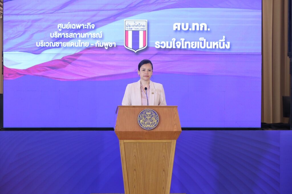พลเรือตรีสุรสันต์ คงสิริ โฆษกกระทรวงกลาโหม พร้อมด้วยนางมาระตี นะลิตา อันดาโม รองอธิบดีกรมสารนิเทศ และรองโฆษกกระทรวงการต่างประเทศ แถลงผลการประชุมศูนย์เฉพาะกิจบริหารสถานการณ์บริเวณชายแดนไทย-กัมพูชา หรือ ศบ.ทก. ประจำวันจันทร์ที่ 4 สิงหาคม 2568