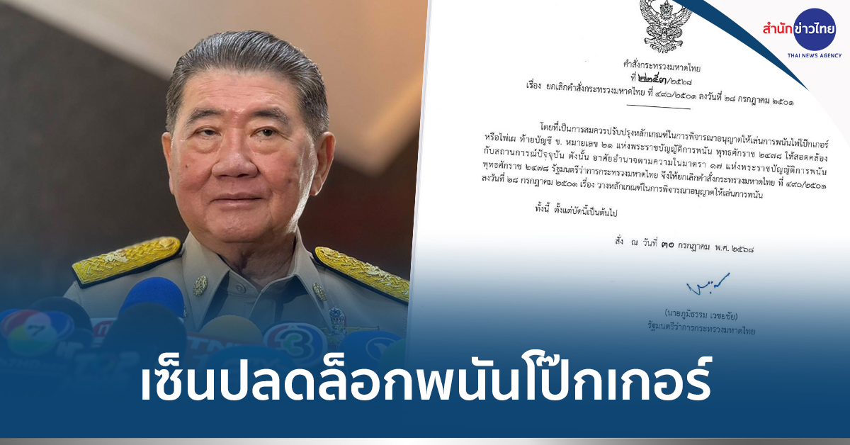 ทั้งนี้ผู้สื่อข่าวรายงานว่า นายภูมิธรรม ได้ลงนามเซ็นคำสั่งกระทรวงมหาดไทย ที่ 2253/2568 เรื่อง ยกเลิกคำสั่งกระทรวงมหาดไทย ที่ 490/2501 ลงวันที่ 28 ก.ค. 2501 โดยมีรายละเอียดที่เป็นการสมควรปรับปรุงหลักเกณฑ์ในการพิจารณาอนุญาตให้เล่นการพนันไพ่โป๊กเกอร์ หรือไพ่เผ ท้ายบัญชี ข. หมายเลข 21 แห่งพระราชบัญญัติการพนัน พุทธศักราช 2478 ให้สอดคล้องกับสถานการณ์ปัจจุบัน ดังนั้น อาศัยอำนาจตามความในมาตรา 17 แห่งพระราชบัญญัติการพนัน พุทธศักราช 2478 รัฐมนตรีว่าการกระทรวงมหาดไทยจึงให้ยกเลิกคำสั่งกระทรวงมหาดไทย ที่ 490/2501 ลงวันที่ 28 ก.ค. 2501 เรื่อง วางหลักเกณฑ์ในการพิจารณาอนุญาตให้เล่นการพนัน ทั้งนี้ ตั้งแต่บัดนี้เป็นต้นไป สั่ง ณ วันที่ 30 ก.ค.2568.-319 -สำนักข่าวไทย