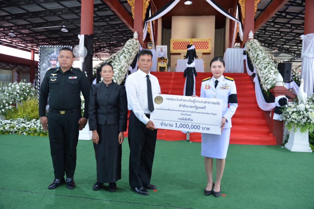 โอกาสนี้ นางสาวจิราพร ยังได้เป็นตัวแทนรัฐบาลมอบเงินช่วยเหลือจากกองทุนช่วยเหลือผู้ประสบสาธารณภัย สำนักนายกรัฐมนตรี เงินช่วยเหลือผู้ประสบสาธารณภัยจากการสู้รบ จำนวน 1,000,000 บาท ให้กับครอบครัวผู้เสียชีวิต ซึ่งเป็นการดูแลเบื้องต้น ขณะนี้รัฐบาลอยู่ระหว่างการพิจารณามาตรการเยียวยาเพิ่มเติม ซึ่งคาดว่าจะได้ข้อสรุปและเสนอต่อคณะรัฐมนตรีพิจารณาเห็นชอบในวันพรุ่งนี้ ( 5 ส.ค.)