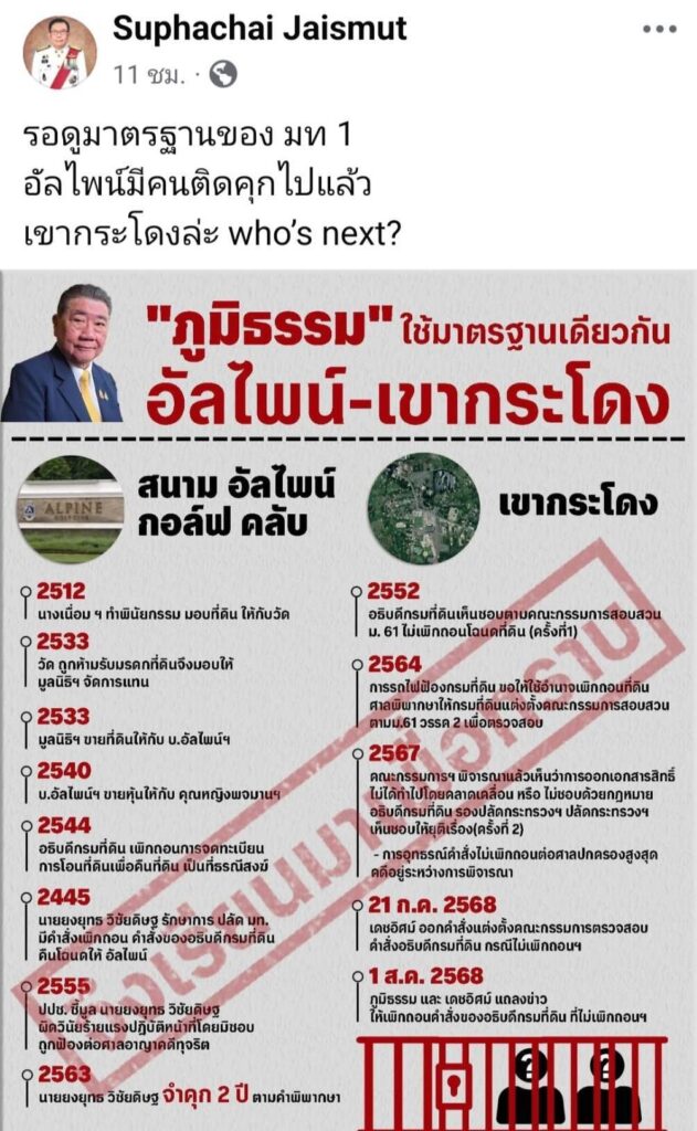 นายศุภชัย ใจสมุทร ประธานคณะทำงานฝ่ายกฎหมายพรรคภูมิใจไทย กล่าวถึงกรณีที่นายภูมิธรรม เวชยชัย รองนายกฯ และรัฐมนตรีว่าการกระทรวงมหาดไทย กล่าวว่า จะใช้มาตรฐานเดียวกันในการจัดการเรื่องของสนามกอล์ฟอัลไพน์ กับเขากระโดง จึงอยากจะทบทวนให้ฟังว่า ตั้งแต่นางเนื่อม ชำนาญชาติศักดา ได้ทำพินัยกรรมยกที่ดินจำนวน 732 ไร่ ให้กับวัดธรรมิการามวรวิหาร จ.ประจวบคีรีขันธ์ วันที่ 22 พ.ย.2512 ต่อมานางเนื่อมถึงแก่กรรมเมื่อวันที่ 22 พ.ค.2514 จึงมีการตั้งผู้จัดการมรดก แทนที่ที่ดินดังกล่าวจะถูกจดทะเบียนโอนให้เป็นกรรมสิทธิ์ของวัดก็หาไม่ เพราะพระราชเมธาภรณ์ อดีตเจ้าอาวาส แสดงเจตจำนงจะขายที่ดินของวัด แต่ผู้จัดการมรดกเดิมที่มีจำนวน 3 คนไม่ยอม อดีตเจ้าอาวาสจึงตั้งมูลนิธิมหามกุฏฯ ให้เป็นผู้จัดการมรดก ต่อมาได้โอนที่ดินทั้งสองแปลงให้แก่มูลนิธิมหามกุฏฯ แล้วจดทะเบียนขายให้แก่บริษัท อัลไพน์ เรียลเอสเตท กับ บริษัท อัลไพน์ กอล์ฟแอนด์สปอร์ตคลับ ในวันที่ 31 ส.ค. 2533 รวมเป็นเงินทั้งสิ้น 130 ล้านบาท โดยบริษัทดังกล่าวมีนางอุไรวรรณ เทียนทอง (ภรรยาของนายเสนาะ เทียนทอง) และนายชูชีพ หาญสวัสดิ์ เป็นผู้ถือหุ้น