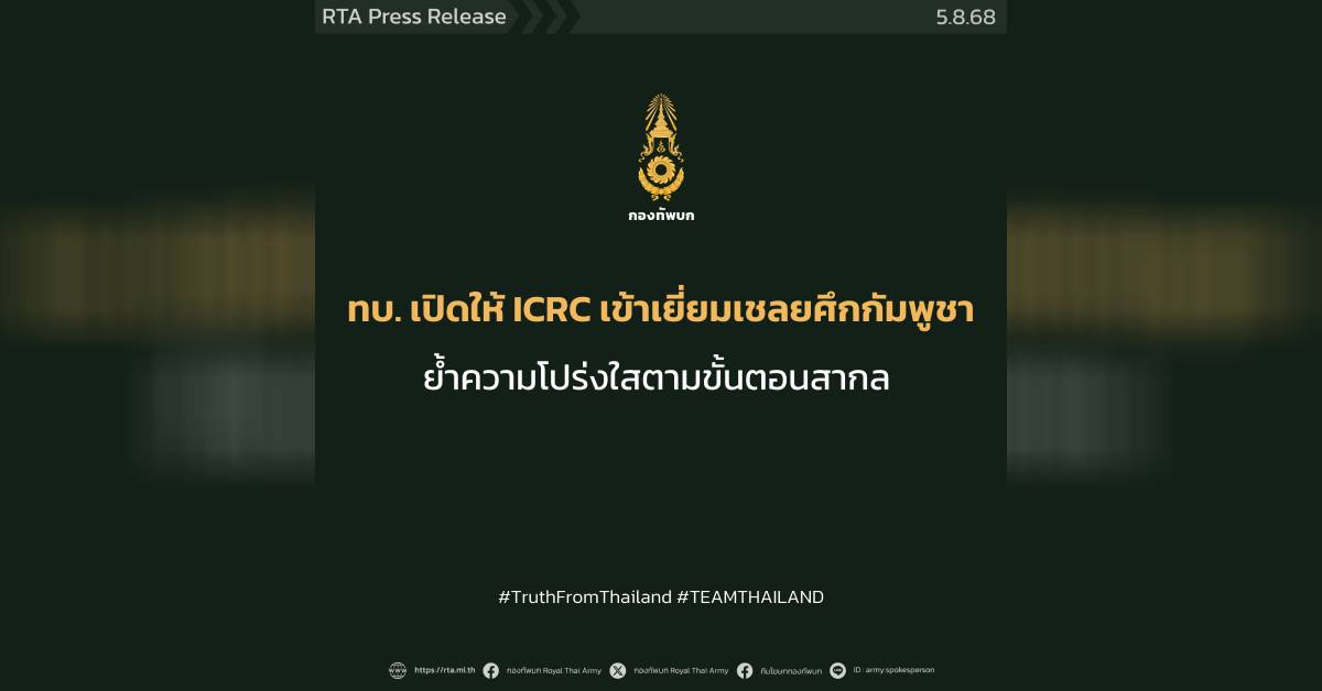 กทม. 5 ส.ค.-กองทัพบก เปิดพื้นที่ให้คณะ ICRC เข้าเยี่ยมเชลยศึกกัมพูชา ตามขั้นตอนสากล ยืนยันยึดหลักมนุษยธรรมระหว่างประเทศอย่างเคร่งครัด