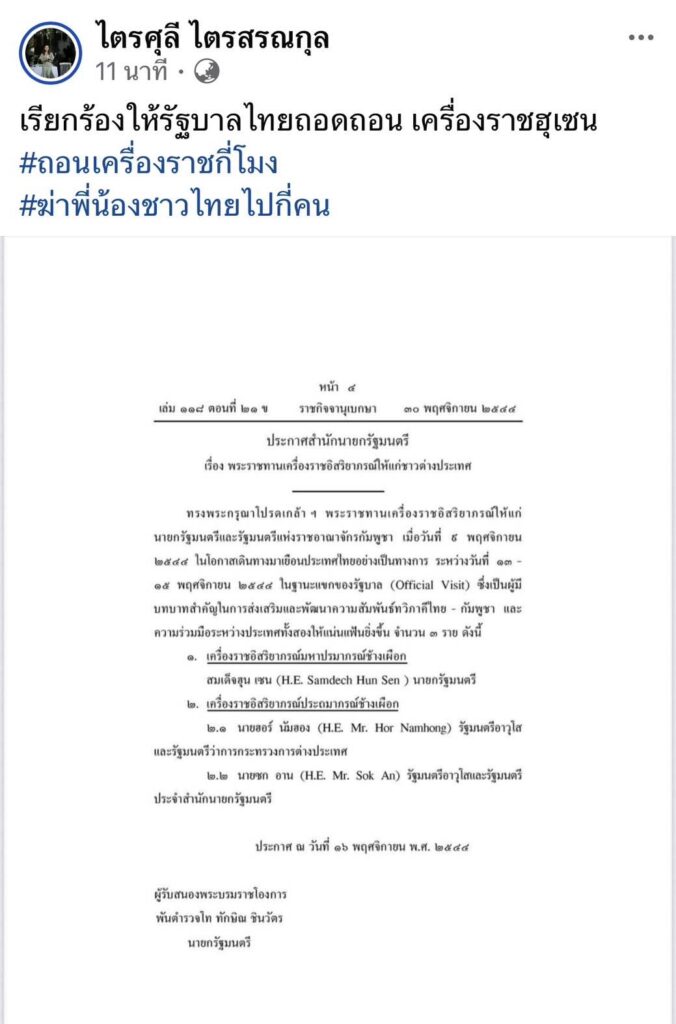 น.ส.ไตรศุลี ไตรสรณกุล อดีตเลขานุการรัฐมนตรีกระทรวงกระทรวงมหาดไทย โพสต์เฟซบุ๊กส่วนตัวขอเรียกร้องให้รัฐบาลไทยถอดถอนเครื่องราชฯ ฮุน เซน พร้อมติด #ถอนเครื่องราชกี่โมง #ฆ่าพี่น้องชาวไทยไปกี่คน