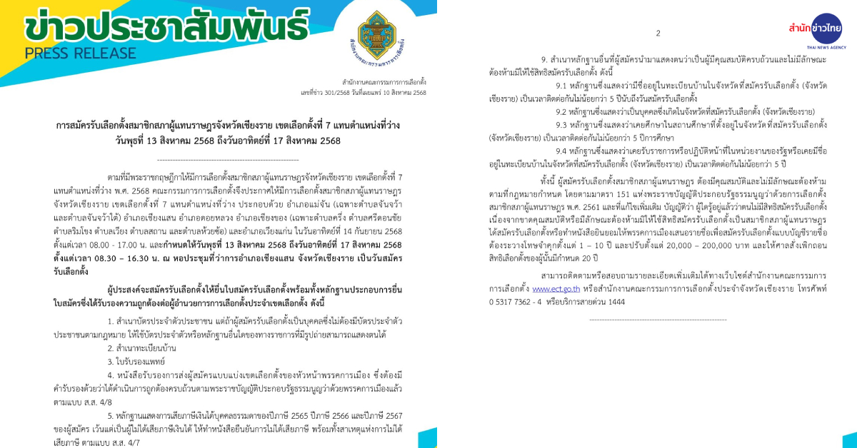 กกต. 10 ส.ค. – กกต. พร้อมสมัครรับเลือกตั้งซ่อม สส.เขต 7 เชียงราย ระหว่างวันที่ 13-17 สิงหาคมนี้ ที่หอประชุมที่ว่าการอำเภอเชียงแสน จังหวัดเชียงราย เตือนตรวจสอบให้ดีก่อนสมัคร หากขาดคุณสมบัติแล้วยังมาสมัครมีโทษ