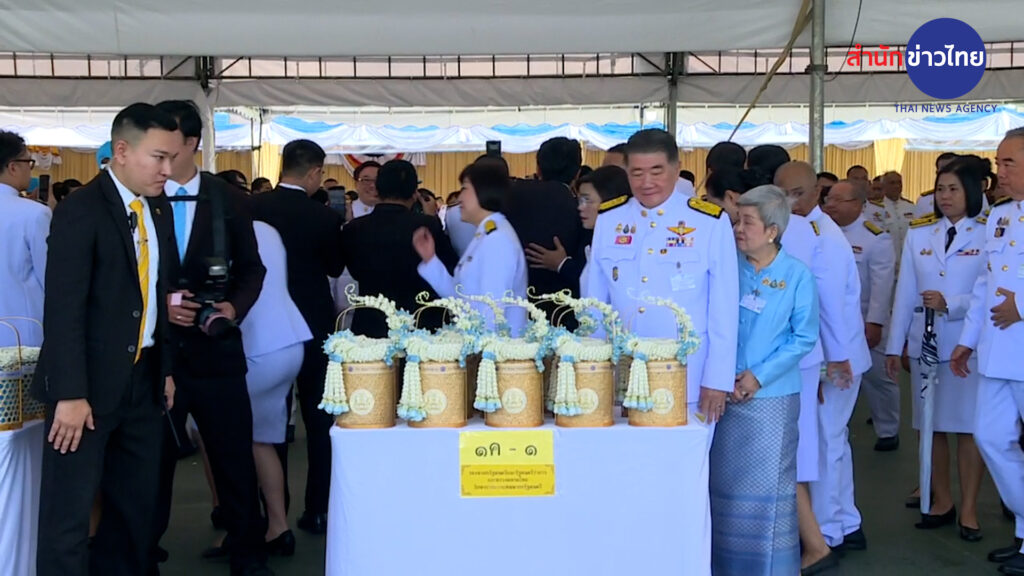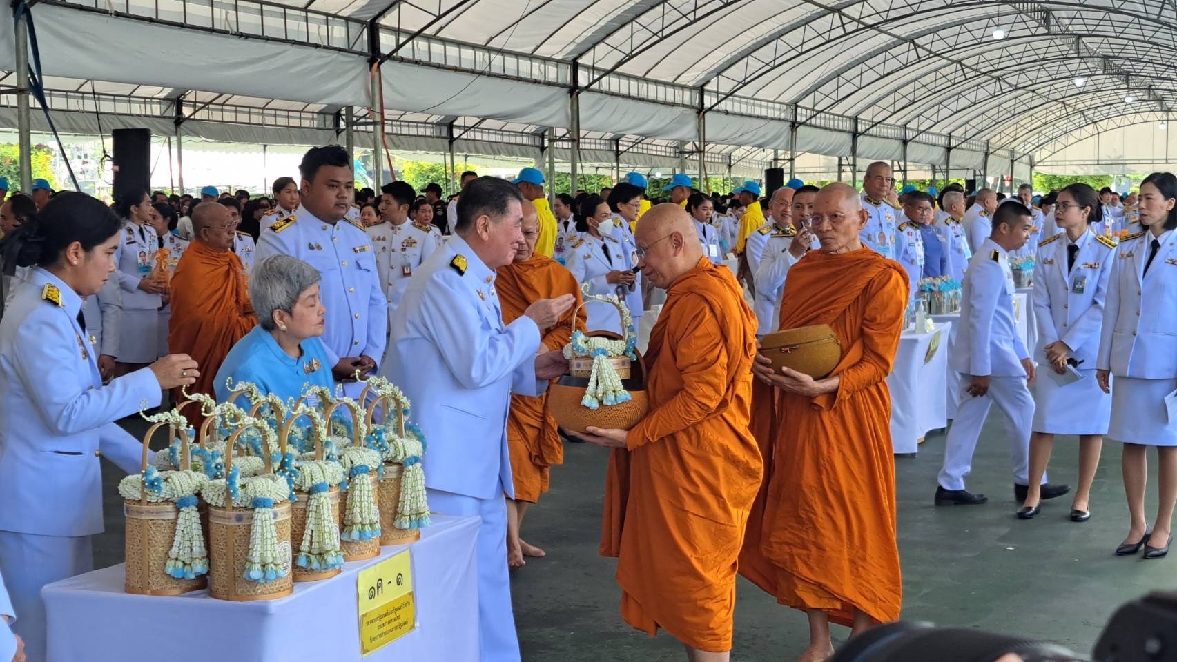 จากนั้นประธานองคมนตรีและภริยา คณะองคมนตรีและภริยา รักษาราชการแทนนายกรัฐมนตรี ประธานรัฐสภา ประธานศาลฎีกา ประธานองค์กรตามรัฐธรรมนูญ ถวายเครื่องไทยธรรมแด่พระสงฆ์ 10 รูป ถวายผ้าไตรจำนวน 10 ไตร กรวดน้ำรับพร กราบลาพระรัตนตรัย แล้วถวายความเคารพหน้าพระฉายาลักษณ์สมเด็จพระนางเจ้าสิริกิติ์ พระบรมราชินีนาถ พระบรมราชชนนีพันปีหลวง ก่อนที่จะนำผู้เข้าร่วมพิธีร่วมตักบาตรพระสงฆ์ จำนวน 194 รูป