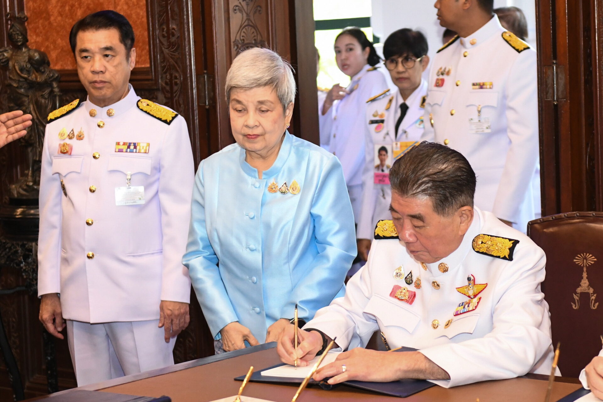 ชุดที่ 1 รักษาราชการแทนนายกรัฐมนตรี พร้อมรองนายกรัฐมนตรี ทูลเกล้าฯ ถวายแจกันดอกไม้ในนาม “นายกรัฐมนตรีและคณะรัฐมนตรี”