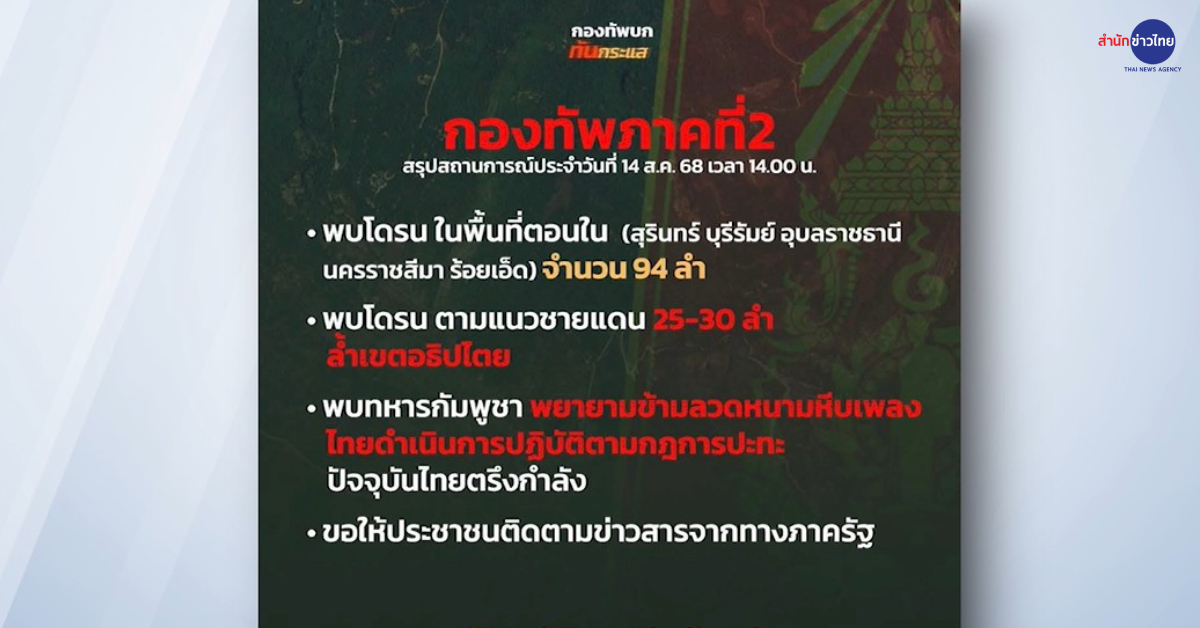 ศูนย์ปฏิบัติการกองทัพภาคที่ 2 อัปเดตสถานการณ์ตามแนวชายแดนไทย-กัมพูชา ยังตรวจพบโดรนในหลายพื้นที่ และยังตรวจพบความเคลื่อนไหวของทหารกัมพูชา พยายามเข้ามาเกาะแนวลวดหนามหีบเพลงบริเวณฐานปฏิบัติการฝ่ายไทย