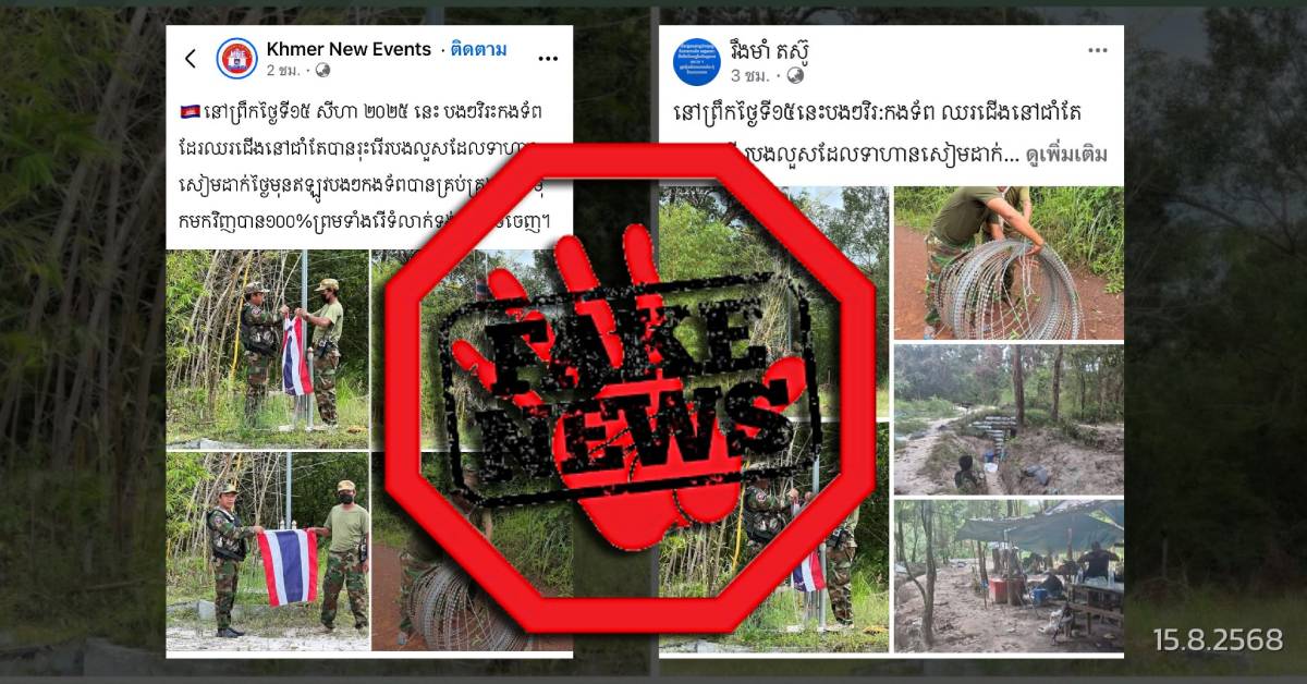 กทม. 15 ส.ค.-“ทบ.-ทภ.2” ยืนยันภาพเขมรรื้อถอน “ลวดหนาม-ธงชาติ” เป็นเฟคนิวส์ คาดฝ่ายกัมพูชาทำคอนเทนต์สร้างกระแส ให้เห็นว่าไม่ยอมฝ่ายไทย เตรียมประท้วงขัดข้อตกลง “จีบีซี” แม่ทัพภาค 2 ยันทุกอย่างอยู่ที่เดิม