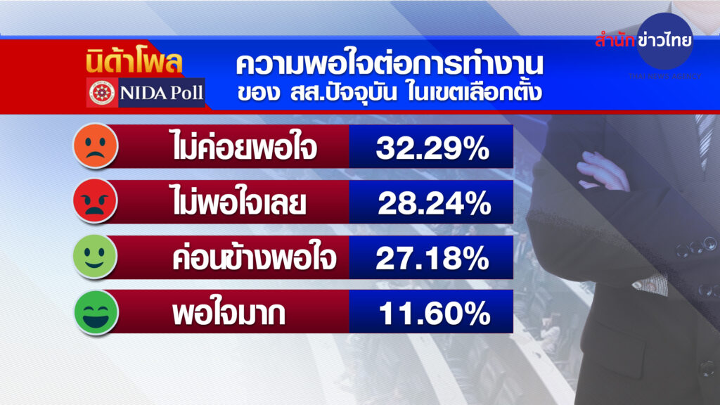 เมื่อถามความพอใจของประชาชนต่อการทำงานของ สส. ปัจจุบัน ในเขตเลือกตั้ง พบว่าร้อยละ 32.29 ไม่ค่อยพอใจ รองลงมา ร้อยละ 28.24 ไม่พอใจเลย ร้อยละ 27.18 ค่อนข้างพอใจ ร้อยละ 11.60 พอใจมาก และร้อยละ 0.69 ไม่ตอบ