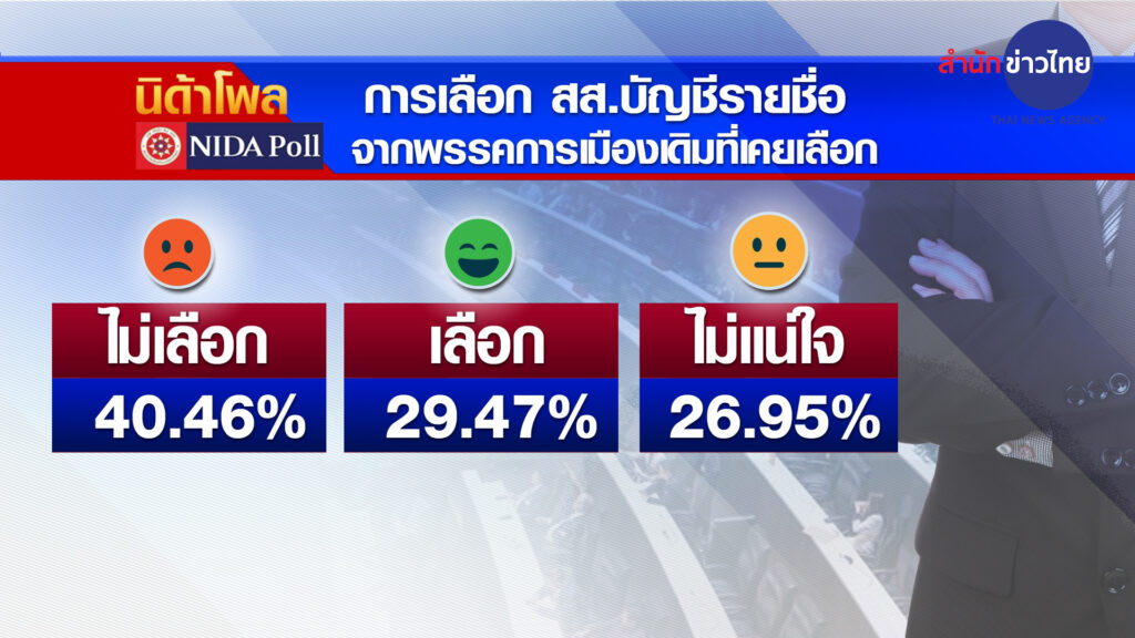 ท้ายที่สุด เมื่อถามถึงการเลือก สส. แบบบัญชีรายชื่อ จากพรรคการเมืองเดิมที่เคยเลือกเมื่อปี 2566 หากวันนี้เป็นวันเลือกตั้ง พบว่า ร้อยละ 40.46 ไม่เลือก รองลงมา ร้อยละ 29.47 เลือก ร้อยละ 26.95ไม่แน่ใจ และร้อยละ 3.12 ยังไม่เคยไป/ไม่ไปลงคะแนน -สำนักข่าวไทย