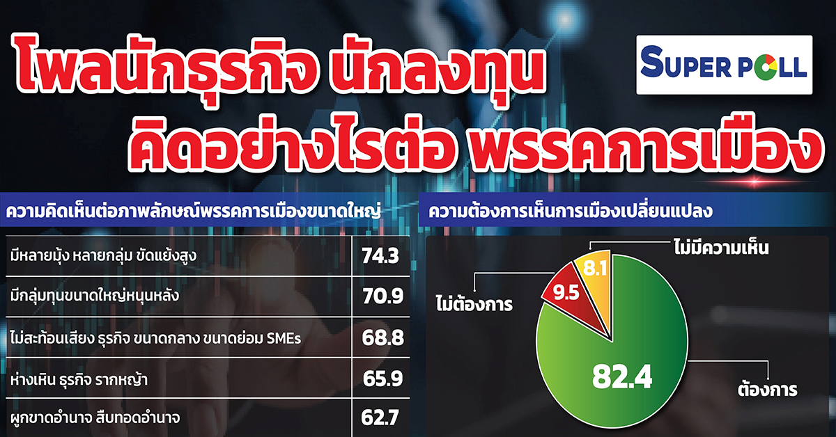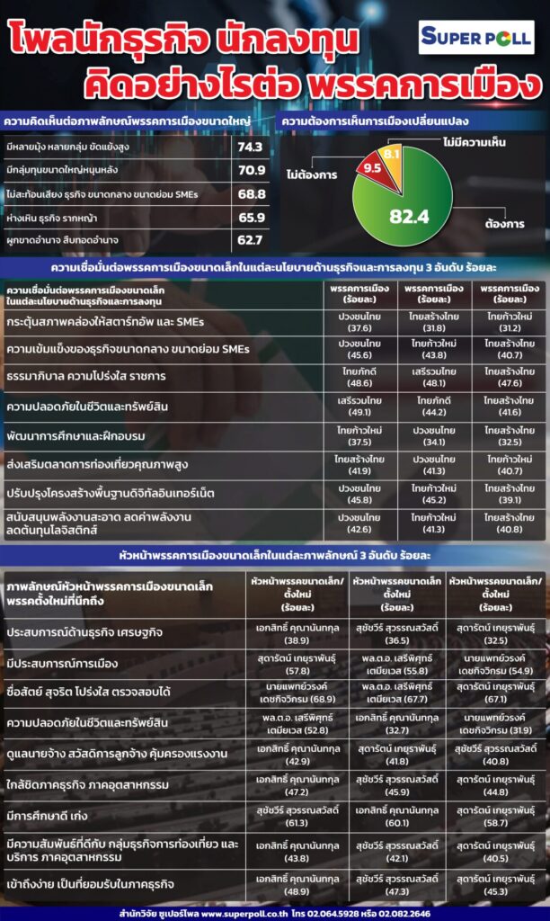 กรุงเทพฯ 17 ส.ค.- ซูเปอร์โพล เผยนักธุรกิจ-นักลงทุน 82.4% ต้องการเห็นการเมืองไทยเกิดการเปลี่ยนแปลง ชี้พรรคใหญ่มุ้งเยอะทำคนเบื่อ จับตาพรรคเล็กแจ้งเกิดการเมืองใหม่ ขณะที่ “อาร์ท-เอกสิทธิ์” จากปวงชนไทย นำกระตุ้น SMEs-ท่องเที่ยว ด้าน “ดร.เอ้” เด่นการศึกษา ส่วน “สุดารัตน์” มีประสบการณ์การเมือง