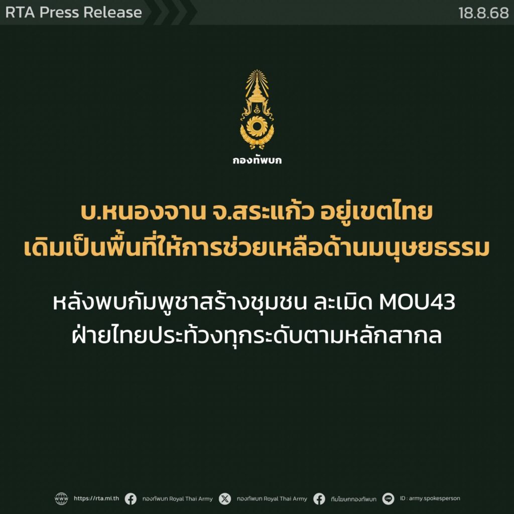 กองทัพบก 18 ส.ค.- ทบ. แจงพื้นที่บ้านหนองจาน อยู่ในเขตประเทศไทย เดิมเคยเป็นที่ช่วยเหลือชาวกัมพูชาลี้ภัยจากการสู้รบชั่วคราว ภายหลังพบมีการขยายชุมชน ละเมิด MOU43 แม้ฝ่ายไทยมีการประท้วงอย่างต่อเนื่อง