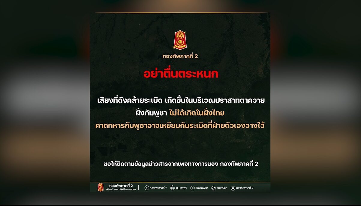 กองทัพภาคที่ 2 โพสต์ชี้แจง ถึงข่าวสารในสื่อออนไลน์ ที่อ้างว่ากองกำลังฝ่ายกัมพูชา ยิงปืนใหญ่ใส่ฐานบริเวณปราสาทตาควายนั้น จากการตรวจสอบข้อเท็จจริงร่วมกับหน่วยในพื้นที่แล้ว ยืนยันว่าข่าวดังกล่าวไม่เป็นความจริง เสียงระเบิดที่ประชาชนได้ยินสันนิษฐานว่า เกิดจากทหารกัมพูชาเหยียบกับระเบิด ที่ลักลอบวางไว้เอง บริเวณด้านหลังปราสาทตาควาย