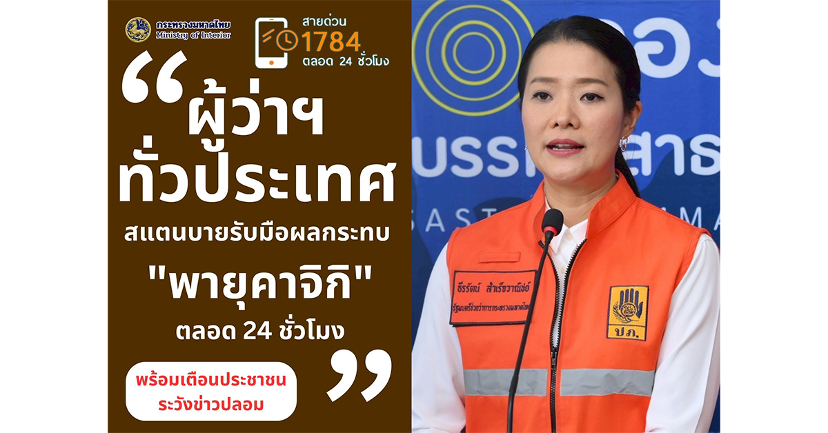 กทม. 22 ส.ค.- “ธีรรัตน์” สั่งการผู้ว่าฯ ทั่วประเทศ สแตนด์บายรับมือผลกระทบ “พายุคาจิกิ” ตลอด 24 ชั่วโมง ย้ำ ประชาสัมพันธ์ข้อมูลให้ประชาชนรับรู้และเตรียมพร้อมอย่างต่อเนื่อง