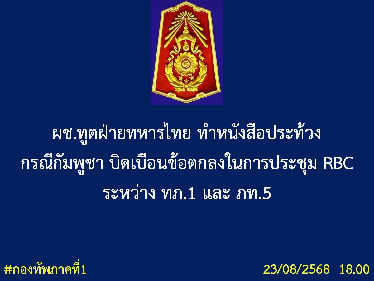 23 ส.ค. – ผช.ทูตฝ่ายทหารไทย ทำหนังสือประท้วงกรณีกัมพูชาบิดเบือนข้อตกลงในการประชุม RBC ระหว่าง ทภ.1 กับ ภท.5