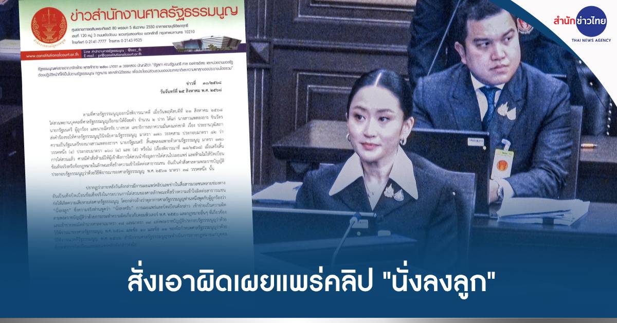 ศาล รธน. 25 ส.ค.-ศาลรัฐธรรมนูญ สั่งเอาผิดเผยแพร่คลิป “นั่งลงลูก” ชี้บิดเบือน-ทำเสียหาย