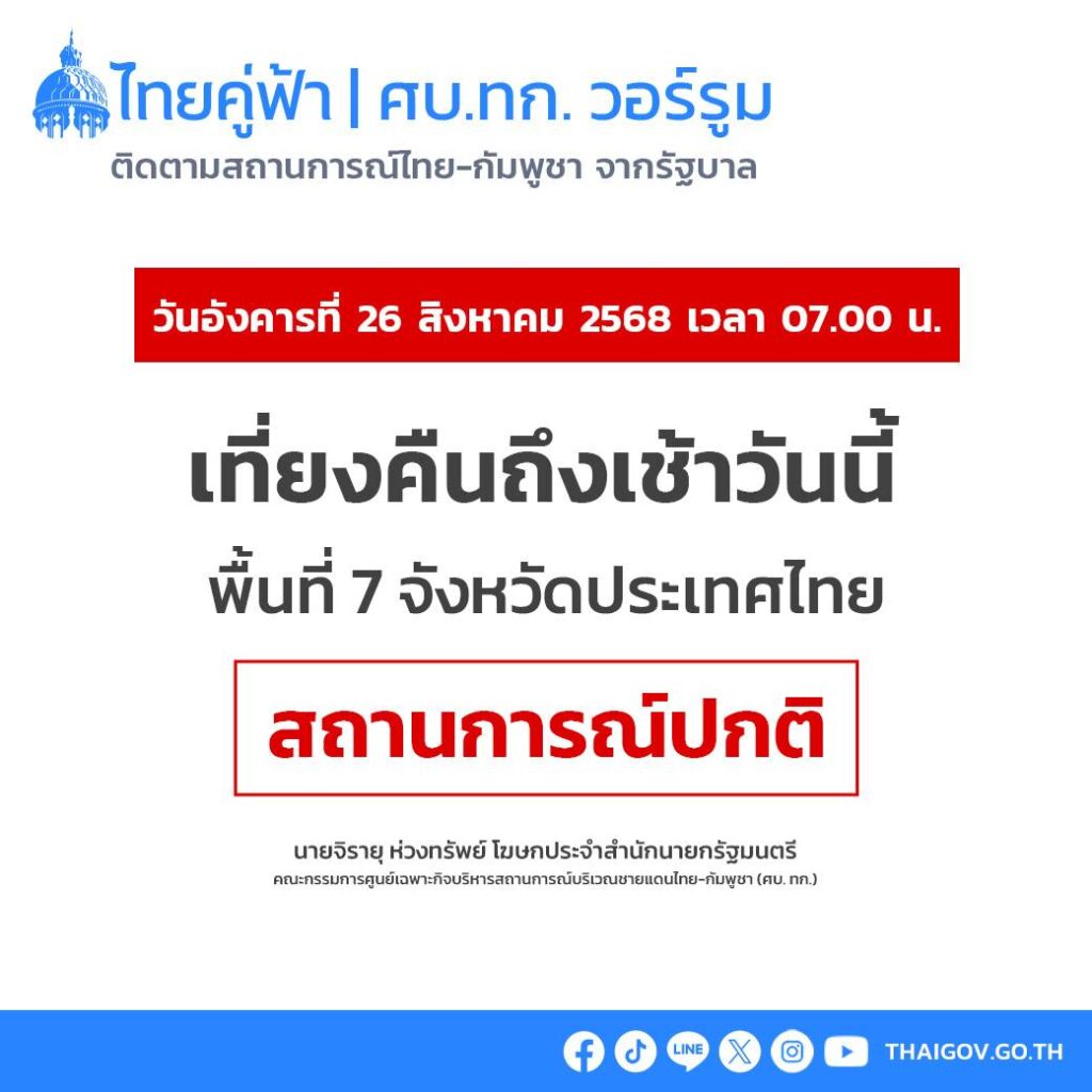 ทำเนียบ 26 ส.ค.- สถานการณ์ชายแดน 7 จังหวัด ปกติ รัฐบาลย้ำดูแลความปลอดภัยชายแดนต่อเนื่อง พร้อมใช้การประชุม RBC เสริมสร้างสันติภาพ