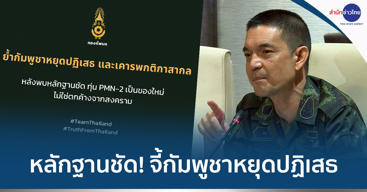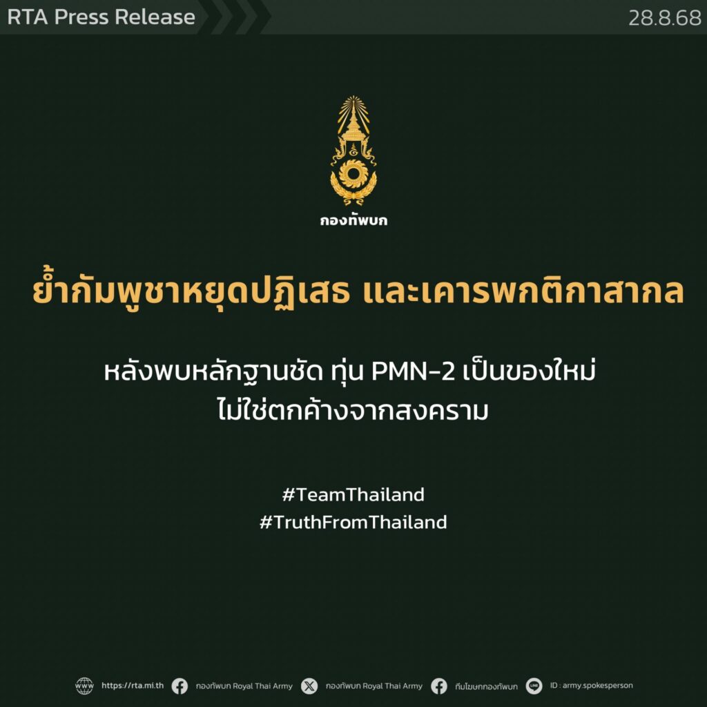 28 ส.ค.- ทบ.ชี้แจงหลักฐานวางทุ่น PMN-2 เป็นของใหม่ ไม่ใช่ตกค้างจากสงคราม จี้กัมพูชาเคารพกติกาสากล หยุดปฏิเสธ หลังพบคลิป-ภาพชัด มีการวางทุ่น PMN-2 จริง