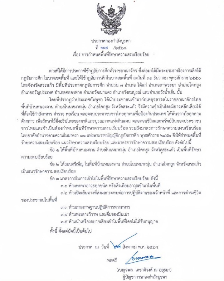 เพื่อป้องกันประเทศ ให้พ้นจากภัยคุกคามดังกล่าว เพื่อรักษาไว้ซึ่งอธิปไตยของชาติและบูรณภาพแห่งดินแดน ตลอดจนชีวิตและทรัพย์สินของประชาชนชาวไทย และจำเป็นต้องกำหนดพื้นที่รักษาความสงบเรียบร้อย รวมถึงมาตรการรักษาความสงบเรียบร้อย และกองกำลังบูรพา กองทัพภาคที่ 1 จะรับผิดชอบในการปกป้องอธิปไตยไทย ไม่ยอมให้ใครรุกล้ำเข้ามาแม้แต่ตารางนิ้วเดียว.-315 -สำนักข่าวไทย