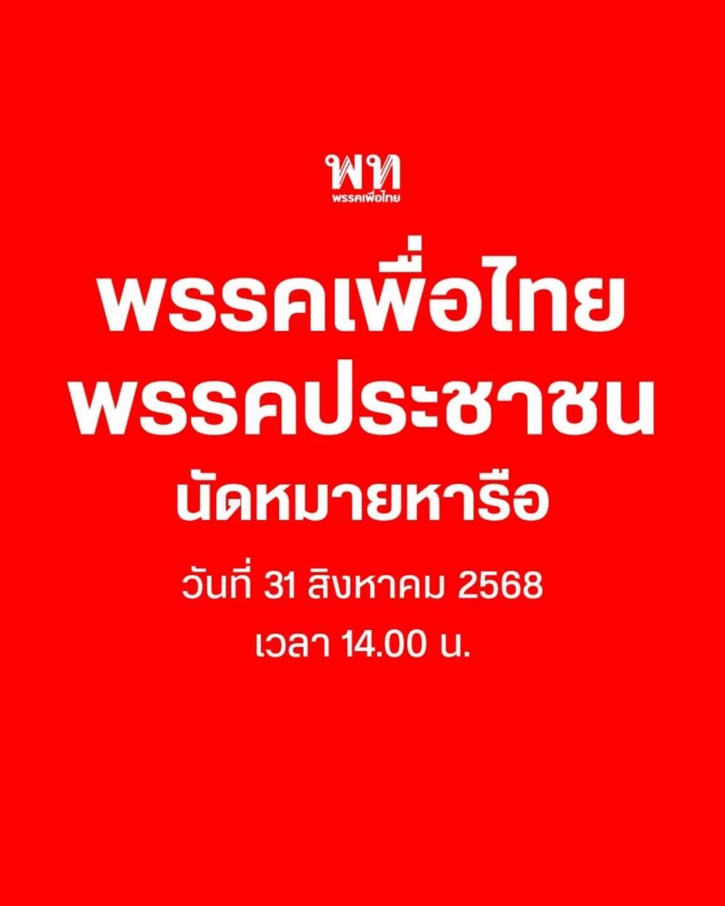 ผู้สื่อข่าวรายงานว่า วันนี้พรรคเพื่อไทยได้ประสานงานและกำหนดนัดหมายกับพรรคประชาชน เพื่อหารือเรื่องข้อเสนอในการจัดตั้งรัฐบาล ในวันนี้ 31 สิงหาคม 2568 ในเวลา 14.00 น. ณ ที่ทำการพรรคประชาชน โดย นายสรวงศ์ เทียนทอง เลขาธิการพรรคเพื่อไทยและนางสาวจิราพร สินธุไพร รองหัวหน้าพรรคเพื่อไทย เป็นตัวแทนของพรรค