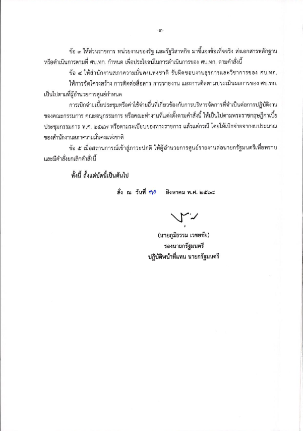 กรุงเทพฯ 31 ส.ค.- “ภูมิธรรม” ลงนามคำสั่งตั้ง “ศบ.ทก.” ขึ้นใหม่เพื่อให้การบริหารสถานการณ์ชายแดนไทย–กัมพูชามีความต่อเนื่อง เหตุคำสั่งเดิมสิ้นสภาพตามนายกรัฐมนตรี