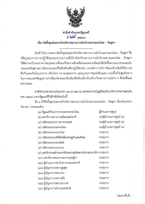 นายภูมิธรรม เวชยชัย รองนายกรัฐมนตรี ปฏิบัติหน้าที่แทนนายกรัฐมนตรีลงนามในคำสั่งสำนักนายกรัฐมนตรีที่ 275/2568 จัดตั้งศูนย์เฉพาะกิจบริหารสถานการณ์บริเวณชายแดนไทย–กัมพูชา (ศบ.ทก.) ขึ้นใหม่ แทนคำสั่งเดิมที่สิ้นสภาพไปพร้อมนายกรัฐมนตรี เพื่อให้การบริหารจัดการสถานการณ์ชายแดนไทย–กัมพูชาเป็นไปอย่างต่อเนื่องและมีเอกภาพ