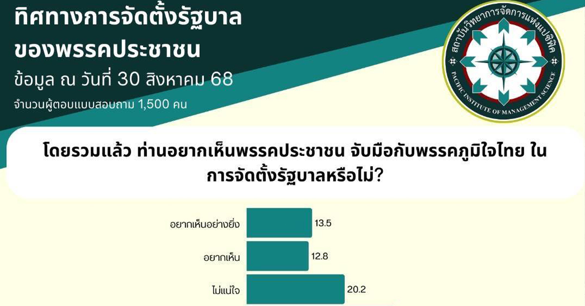 สถาบันวิทยาการจัดการแห่งแปซิฟิค เผยว่า เมื่อวันที่ 30 สิงหาคม 2568 ได้ทำการสำรวจประชาชนทั่วทุกภูมิภาค จำนวน 1,500 คน โดยได้สอบถามถึงเรื่อง “ทิศทางการจัดตั้งรัฐบาล ของพรรคประชาชน”