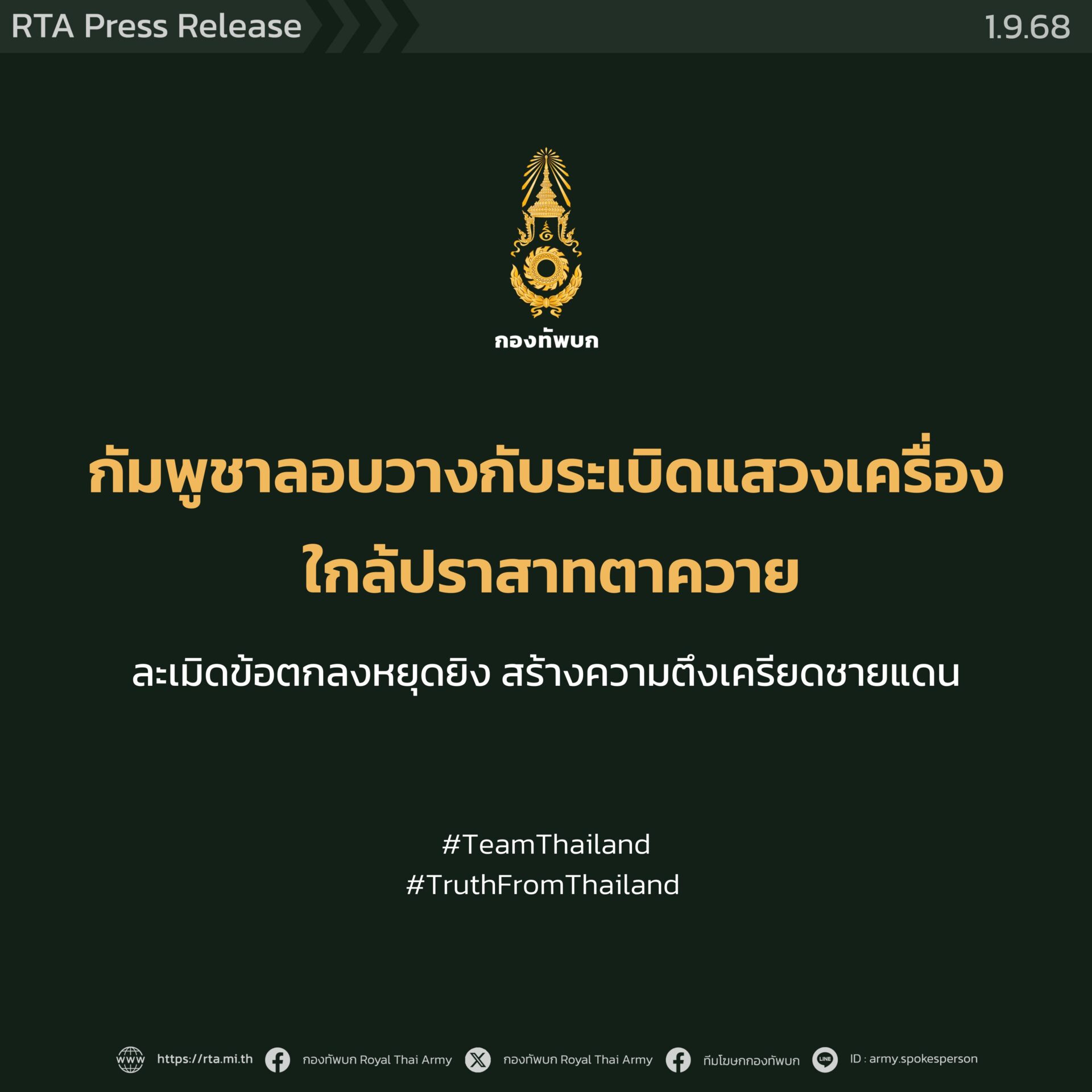 จากกรณีดังกล่าว พลตรี วินธัย สุวารี โฆษกกองทัพบก กล่าวว่า การกระทำและหลักฐานดังกล่าวแสดงให้เห็นถึงการละเมิดข้อตกลงหยุดยิงอย่างชัดเจน ทั้งในเรื่องการใช้กับระเบิดแสวงเครื่อง เป็นอาวุธลอบโจมตีทหารไทยโดยหวังผลให้เกิดอันตรายถึงชีวิตในดินแดนของฝ่ายไทย ซึ่งถือเป็นการกระทำยั่วยุที่ส่งผลให้เกิดความตึงเครียดระหว่างกัน การกระทำดังกล่าวยังย้อนแย้งกับท่าทีที่ฝ่ายกัมพูชาพยายามบิดเบือนต่อประชาคมระหว่างประเทศว่าเป็นผู้รักสันติและยึดมั่นในข้อตกลงหยุดยิง ทั้งที่ข้อเท็จจริงและหลักฐานต่าง ๆ ที่พบ ยืนยันได้ว่ากัมพูชาละเมิดข้อตกลง รวมทั้งอนุสัญญาออตตาวามาโดยตลอด นอกจากนี้ โฆษกกองทัพบกยังได้กล่าวอีกว่า จากการที่ฝ่ายกัมพูชามีการใช้ยุทธวิธีวางทุ่นระเบิด เพื่อลอบทำร้ายฝ่ายไทยอย่างต่อเนื่อง พลเอก พนา แคล้วปลอดทุกข์ ผู้บัญชาการทหารบก ได้สั่งการผ่านกองทัพภาคที่ 2 กำชับให้กำลังพลทุกนายปฏิบัติหน้าที่ด้วยความรอบคอบ ไม่ประมาท และใช้ชุดทหารช่างเก็บกู้ทุ่นระเบิดเข้าตรวจสอบพื้นที่เสี่ยงเพื่อความปลอดภัยในการปฏิบัติภารกิจในทุกครั้ง.-313.-สำนักข่าวไทย