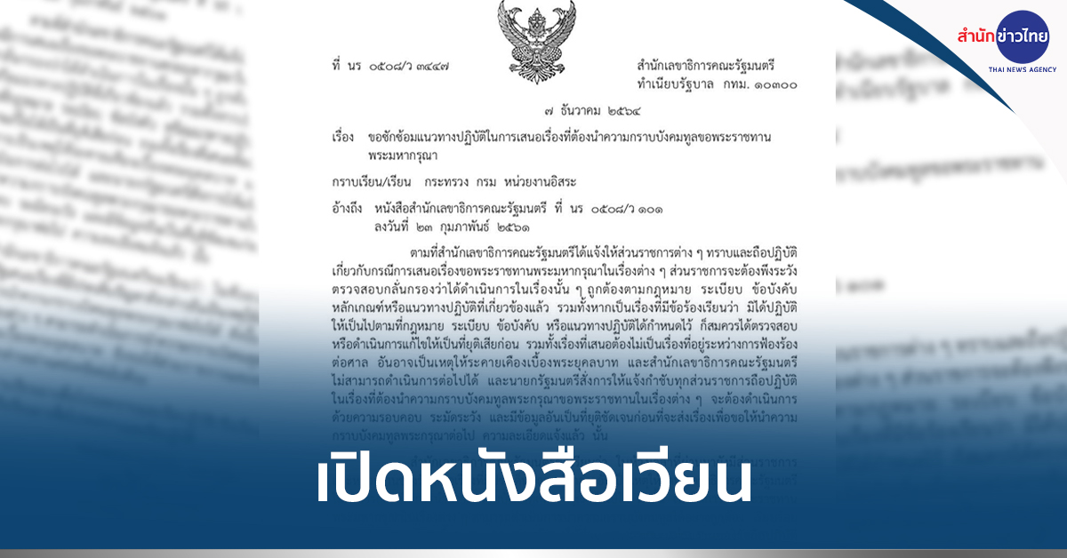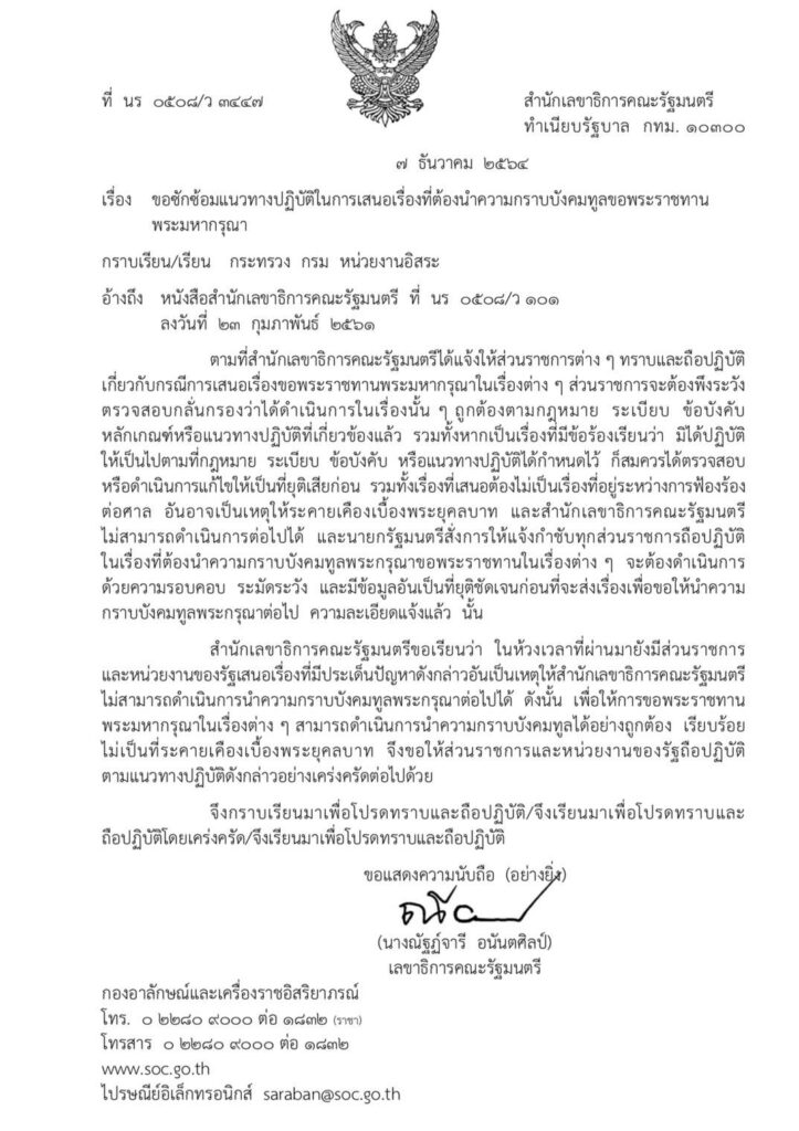 ผู้สื่อข่าวรายงานว่า มีการปรากฏหนังสือที่ นางณัฐฎ์จารีย์ อนันตศิลป์ เลขาธิการคณะรัฐมนตรี ส่งหนังสือเวียน ถึงกระทรวง กรม และหน่วยงานอิสระ เรื่อง ขอซักซ้อมแนวทางปฏิบัติในการเสนอเรื่องที่ต้องนำความกราบบังคมทูลขอพระราชทานพระมหากรุณา