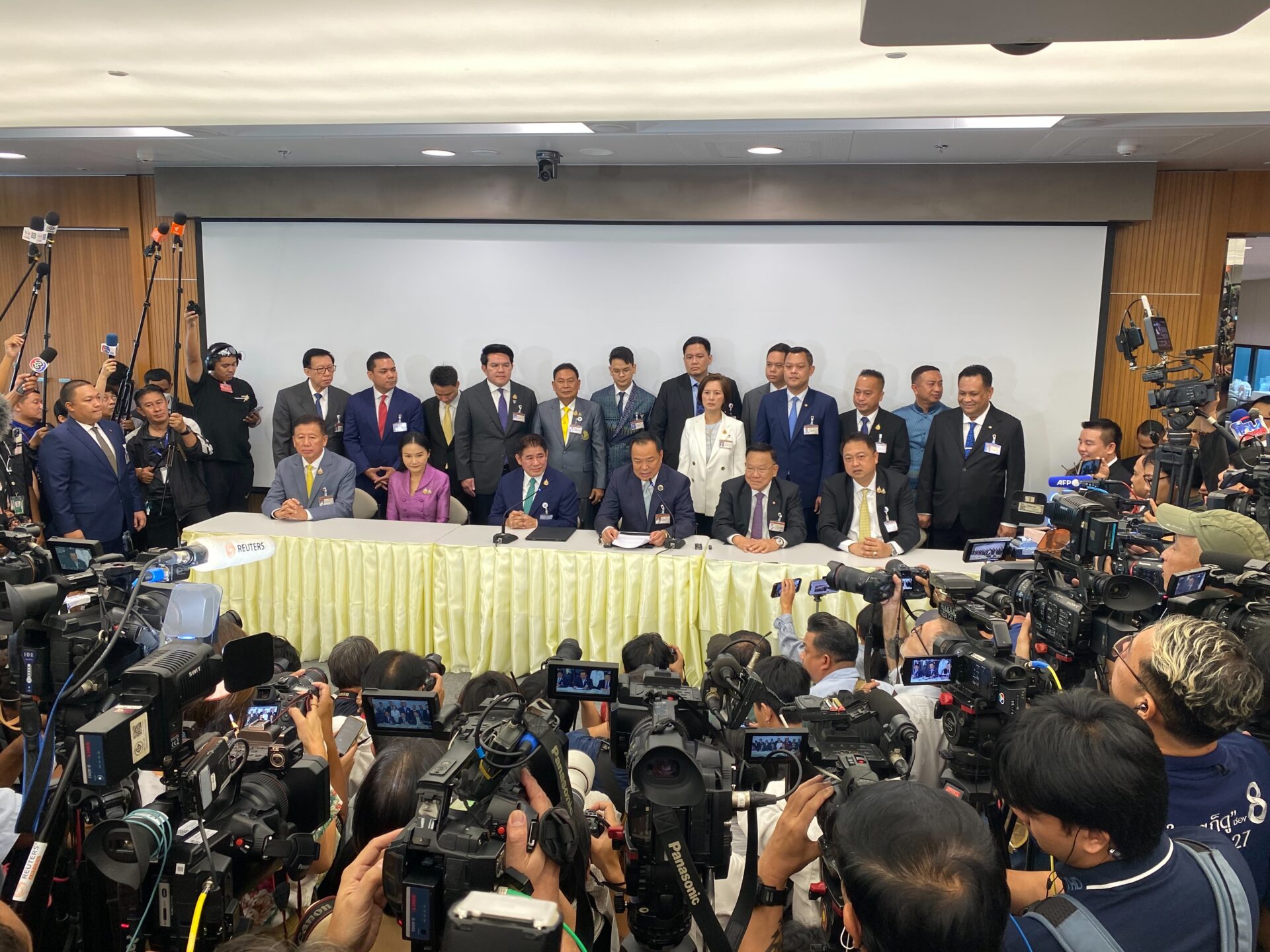 รัฐสภา 3 ก.ย.-พรรคร่วมฯ ใหม่ ตบเท้าร่วมแถลงข่าวจัดตั้งรัฐบาลกับ “ภูมิใจไทย” ก๊วน “สุชาติ-ธรรมนัส-สันติ” ร่วมด้วย ด้านงูเห่า “เพื่อไทย-ปชป.” โผล่โชว์ตัว
