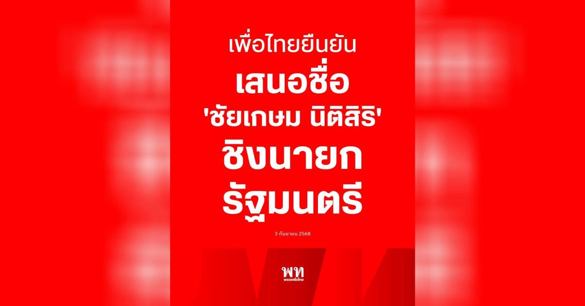 กรุงเทพฯ 4 ก.ย.-“เพื่อไทย” ยืนยันเสนอ “ชัยเกษม นิติสิริ” ชิงโหวตเลือกนายกฯ 5 ก.ย.นี้