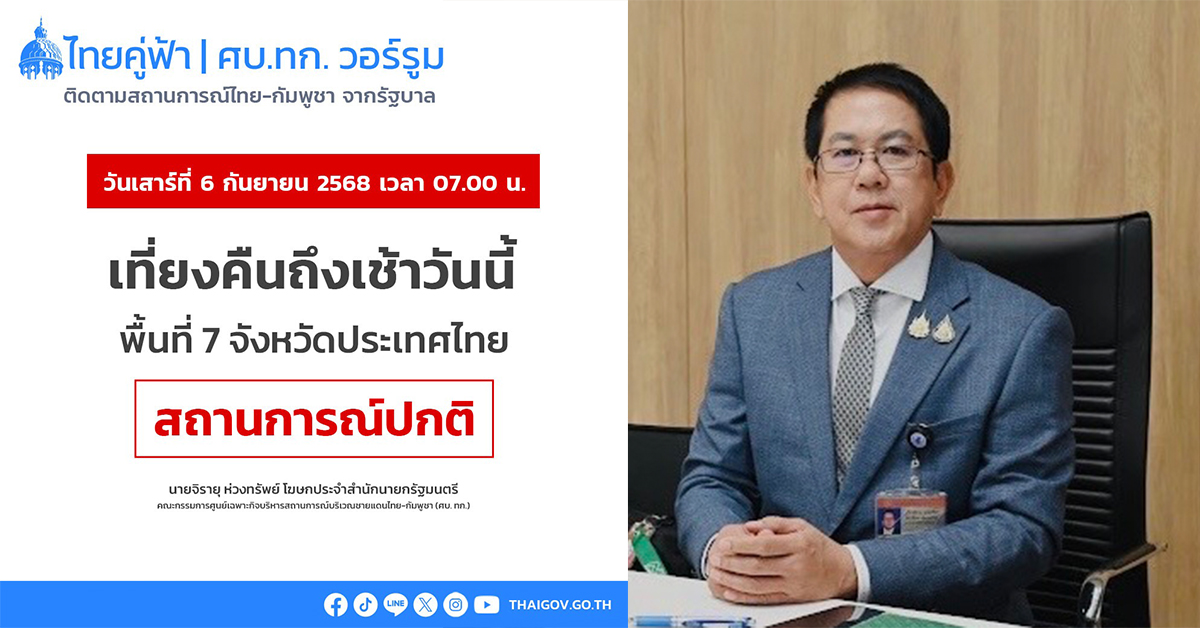 ทำเนียบ 6 ก.ย.- สถานการณ์ชายแดนไทย-กัมพูชา เหตุการณ์ปกติ ตรึงกำลังเข้มบ้านหนองจาน จ.สระแก้ว พร้อมติดตามผลการประชุม GBC ที่เกาะกง พรุ่งนี้