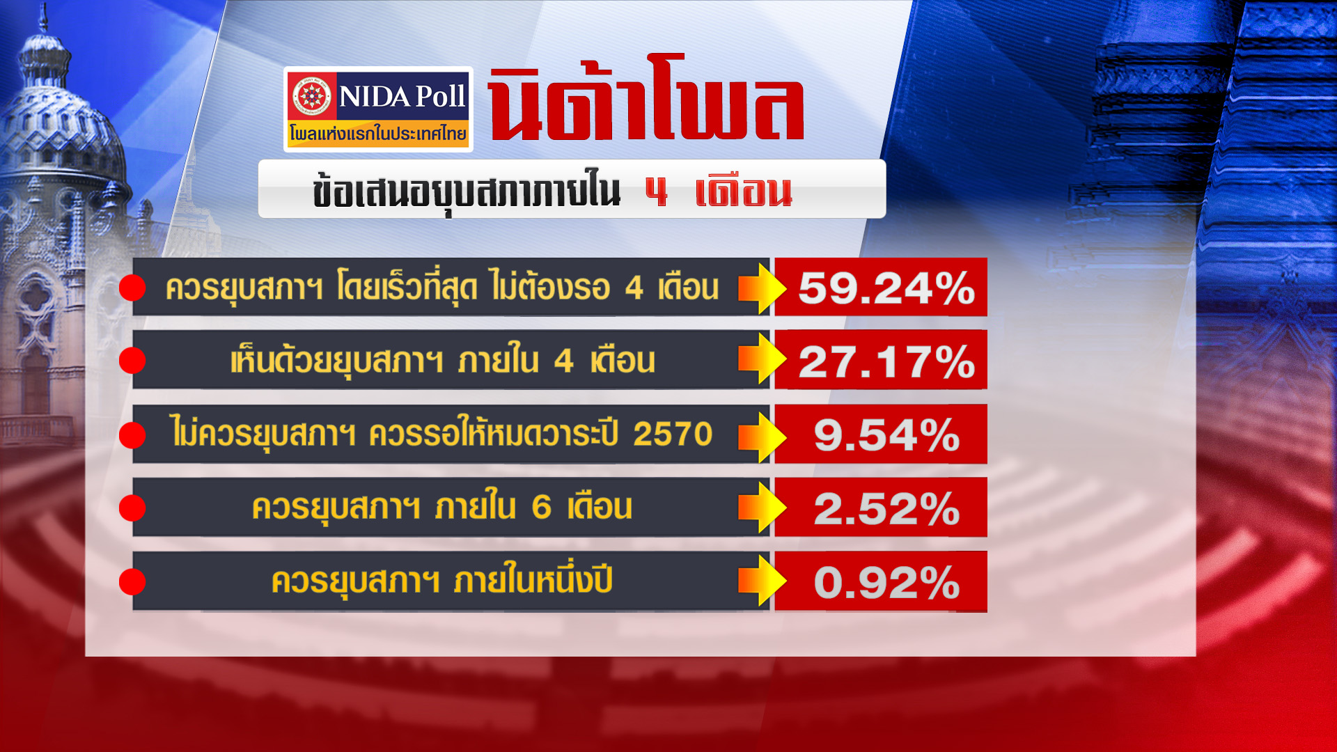 จากการสำรวจ เมื่อถามความคิดเห็นของประชาชนเกี่ยวกับข้อเสนอให้ยุบสภาผู้แทนราษฎรภายใน 4 เดือน พบว่า ตัวอย่างร้อยละ 59.24 ระบุว่า ควรยุบสภาฯ โดยเร็วที่สุด ไม่ต้องรอ 4 เดือน รองลงมา ร้อยละ 27.17 ระบุว่า เห็นด้วยกับการยุบสภาฯ ภายใน 4 เดือน ร้อยละ 9.54 ระบุว่า ไม่ควรยุบสภาฯ แต่ควรรอให้สภาฯ ชุดนี้หมดวาระในปี 2570 ร้อยละ 2.52 ระบุว่า ควรยุบสภาฯ ภายใน 6 เดือน ร้อยละ 0.92 ระบุว่า ควรยุบสภาฯ ภายใน 1 ปี และร้อยละ 0.61 ระบุว่า ไม่ทราบ/ไม่ตอบ/ไม่สนใจ