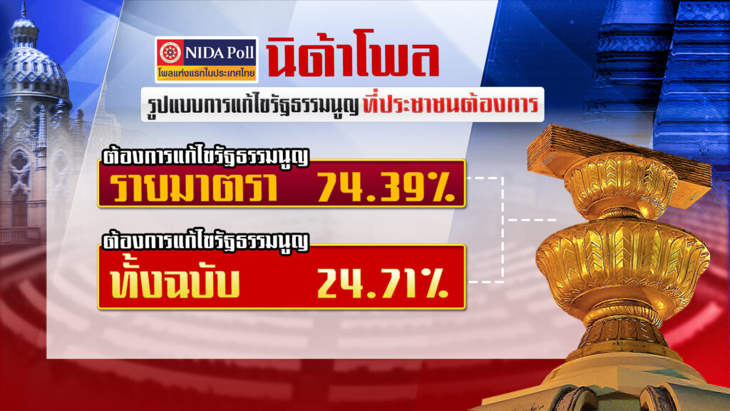ท้ายที่สุดเมื่อสอบถามความคิดเห็นของผู้ที่ระบุว่าต้องการมากและค่อนข้างต้องการแก้ไขรัฐธรรมนูญ จากจำนวน 777 หน่วยตัวอย่าง เกี่ยวกับรูปแบบการแก้ไขรัฐธรรมนูญที่ประชาชนต้องการ พบว่า ตัวอย่างร้อยละ 74.39 ระบุว่า ต้องการแก้ไขรัฐธรรมนูญรายมาตรา รองลงมา ร้อยละ 24.71 ระบุว่า ต้องการแก้ไขรัฐธรรมนูญทั้งฉบับ และร้อยละ 0.90 ระบุว่า ไม่ตอบ.-สำนักข่าวไทย