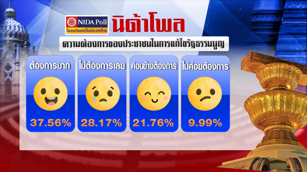 ด้านความต้องการของประชาชนในการแก้ไขรัฐธรรมนูญ พบว่า ตัวอย่างร้อยละ 37.56 ระบุว่า ต้องการมาก รองลงมา ร้อยละ 28.17 ระบุว่า ไม่ต้องการเลย ร้อยละ 21.76 ระบุว่า ค่อนข้างต้องการ ร้อยละ 9.99 ระบุว่า ไม่ค่อยต้องการ และร้อยละ 2.52 ระบุว่า ไม่ทราบ/ไม่ตอบ/ไม่สนใจ