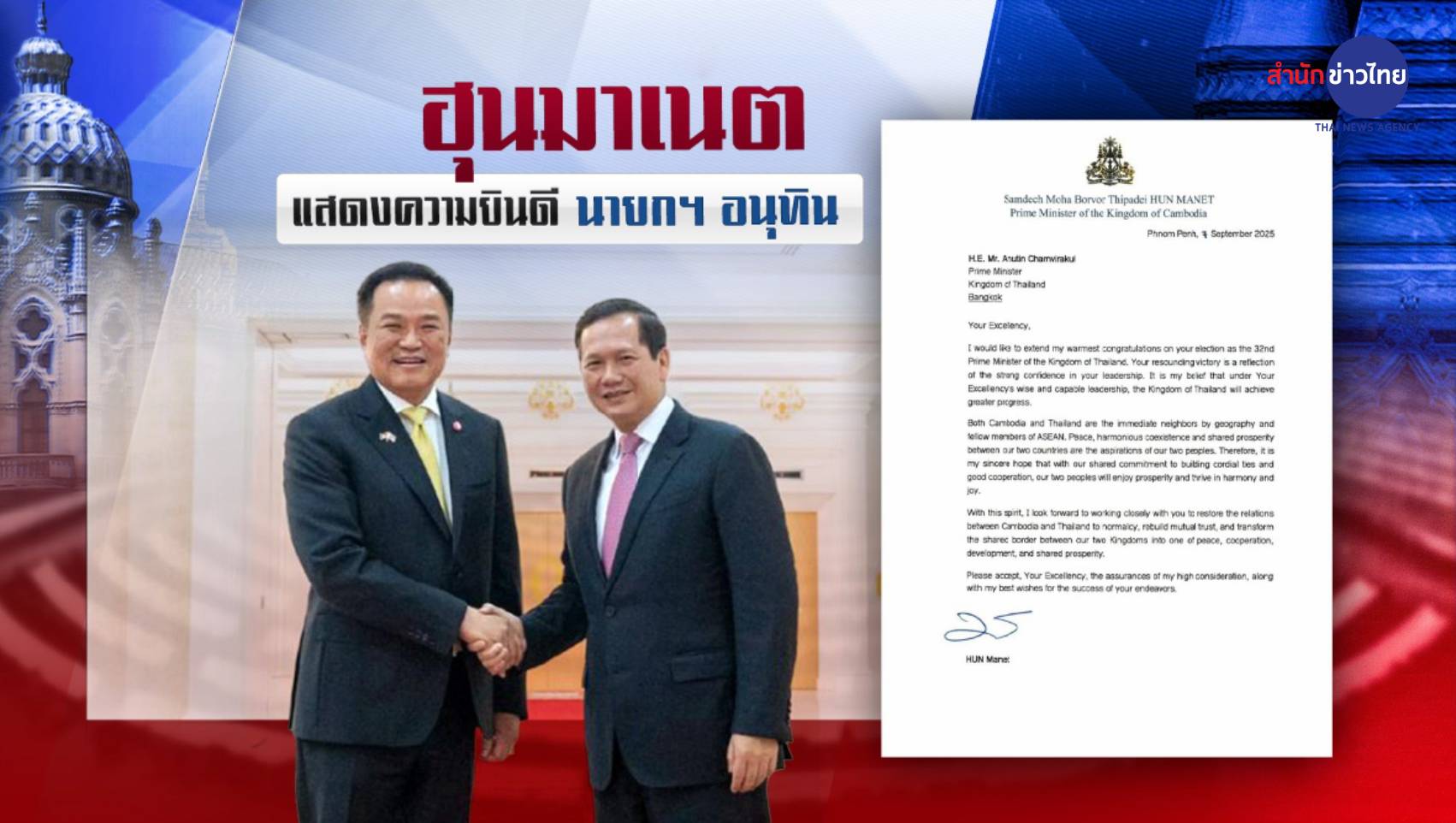 ฮุน มาเนต นายกรัฐมนตรีกัมพูชา โพสต์เฟซบุ๊ก โชว์เอกสารแสดงความยินดีกับ นายอนุทิน ชาญวีรกูล ในฐานะได้รับการแต่งตั้งเป็นนายกรัฐมนตรี