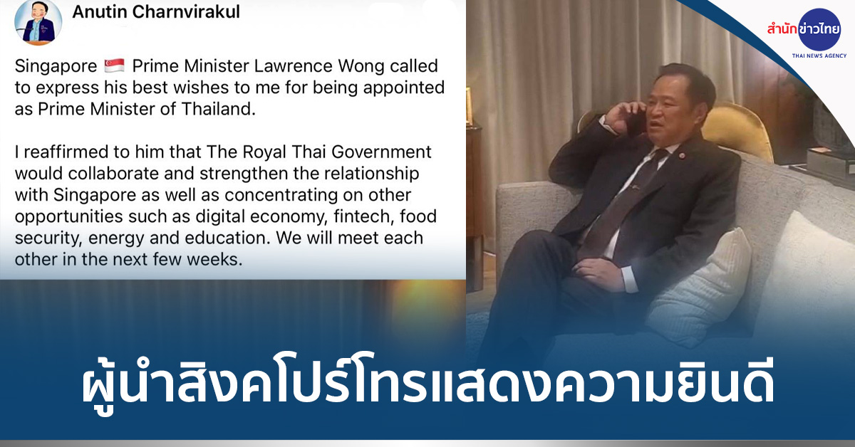 นายอนุทิน ชาญวีรกูล นายกรัฐมนตรี โพสต์ภาพคุยโทรศัพท์ ผ่านเฟซบุ๊กส่วนตัว พร้อมข้อความระบุว่า นายลอว์เรนซ์ หว่อง นายกรัฐมนตรี ประทศสิงคโปร์ ได้โทรศัพท์มาเพื่ออวยพรถึงการดำรงตำแหน่งนายกรัฐมนตรีของประเทศไทย