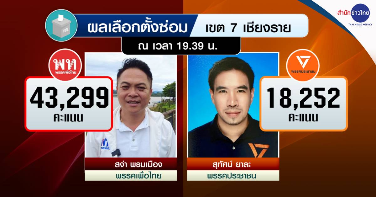 เชียงราย 14 ก.ย. – ผลคะแนนเลือกตั้ง สส. เขต 7 เชียงราย อย่างไม่เป็นทางการ ณ เวลา 19.39 น. “สง่า พรมเมือง” พรรคเพื่อไทย คะแนนนำโด่งทิ้งคู่แข่ง “สุทัศน์ ยาละ” พรรคประชาชน กว่า 2 หมื่นคะแนน ขณะที่เพจเฟซบุ๊กพรรคเพื่อไทย โพสต์ขอบคุณประชาชนเทคะแนนให้ “สง่า” คว้าชัย