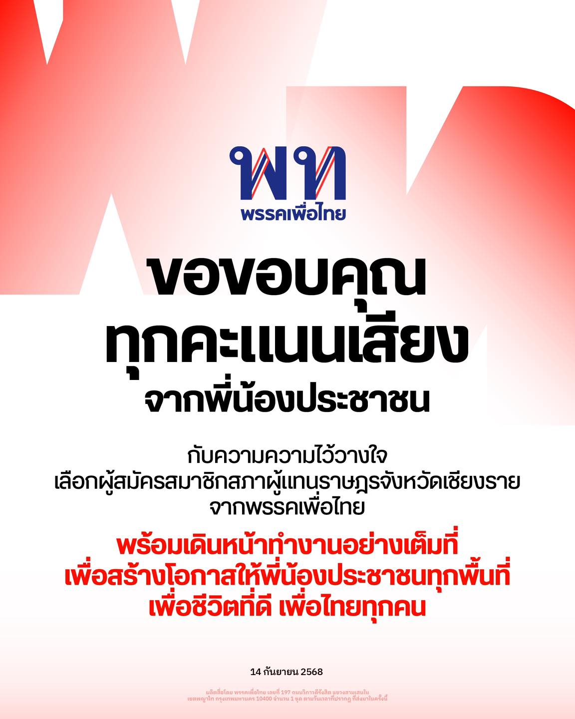 ขณะที่เพจเฟซบุ๊กพรรคเพื่อไทย โพสต์ขอบคุณทุกคะแนนเสียงของประชาชนที่ให้ความไว้วางใจเลือกผู้สมัครจากพรรคเพื่อไทย ทีมงานทุกคนพร้อมเดินหน้าทำงานอย่างเต็มที่. – สำนักข่าวไทย