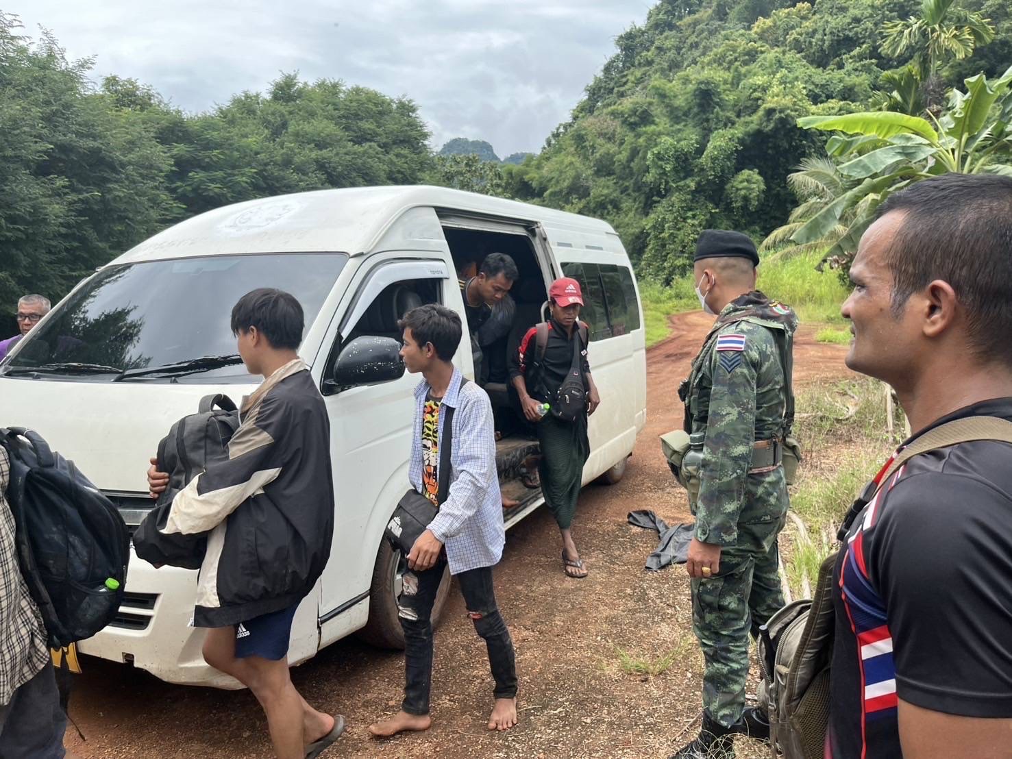 ต่อมาเวลา 10.30 น. ขณะที่เจ้าหน้าที่ฝ่ายความมั่นคงร่วมกันตั้งจุดตรวจจุดสกัดแบบไม่ประจำที่ บริเวณ ถนนหลวงแผ่นดิน 323 หน้าวัดอู่ล่อง ต.ท่าขนุน อ.ทองผาภูมิ จ.กาญจนบุรี สังเกตพบรถตู้ต้องสงสัย จำนวน 3 คัน ขับมาจาก อ.สังขละบุรี มุ่งหน้า อ.เมืองกาญจนบุรี จึงได้ให้สัญญาณหยุดรถเพื่อทำการตรวจสอบ แต่ผู้ขับขี่ได้เร่งเครื่องยนต์หลบหนี เจ้าหน้าที่จึงได้เร่งติดตามอย่างกระชั้นชิด กระทั่งสามารถสกัดจับได้ที่บริเวณ หน้าวัดท่าขนุน ม.1 ต.ท่าขนุน อ.ทองผาภูมิ จ.กาญจนบุรี ต่อมาเจ้าหน้าที่ได้ทำการตรวจสอบอย่างละเอียด พบ นายสุธีฯ อายุ 48 ปี และนายสุรชัยฯ อายุ 40 ปี เป็นผู้ขับขี่รถตู้ ส่วนผู้ขับขี่อีก 1 คน หลบหนีไปก่อนที่เจ้าหน้าที่จะเข้าทำการตรวจสอบ ซึ่งภายในรถตู้ทั้ง 3 คัน บรรทุกบุคคลต่างด้าวผิดกฎหมาย สัญชาติเมียนมา จำนวน 113 คน (ชาย 72 คน และหญิง 41 คน) ซึ่งทั้งหมดไม่สามารถสื่อสารภาษาไทย และไม่มีเอกสารประจำตัวที่ทางราชการออกให้ เจ้าหน้าที่จึงได้ควบคุมตัวไว้ทั้งหมด
