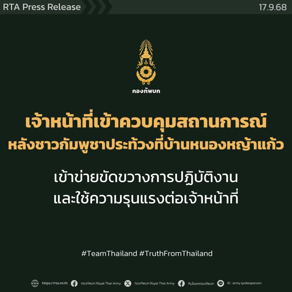 17 ก.ย.- กองทัพบกแจงเหตุเผชิญหน้า “บ้านหนองหญ้าแก้ว” มวลชนกัมพูชาชุมนุมประท้วงก่อความวุ่นวาย-ใช้ความรุนแรง จนท.ฝ่ายไทยจำเป็นต้องใช้แก๊สน้ำตา-กระสุนยาง เพื่อควบคุมสถานการณ์