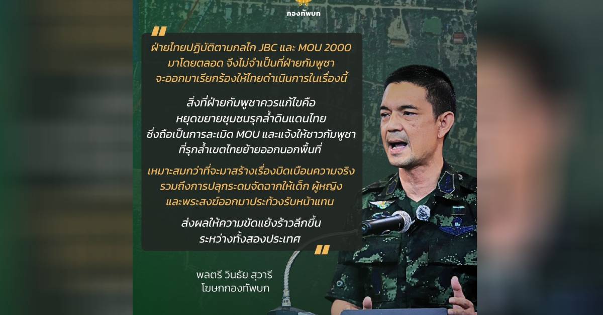 โฆษกกองทัพบกยืนยันว่า ฝ่ายไทยปฏิบัติตามกลไก JBC และ MOU 2000 มาโดยตลอด จึงไม่จำเป็นที่ฝ่ายกัมพูชาจะออกมาเรียกร้องให้ไทยดำเนินการในเรื่องนี้ สิ่งที่ฝ่ายกัมพูชาควรแก้ไขคือ หยุดขยายชุมชนรุกล้ำดินแดนไทยซึ่งถือเป็นการละเมิด MOU 2000 และแจ้งให้ชาวกัมพูชาที่รุกล้ำเขตไทยย้ายออกนอกพื้นที่ ตามที่ผู้ว่าราชการจังหวัดสระแก้วได้ประกาศไว้ เหมาะสมกว่าที่จะมาสร้างเรื่องบิดเบือนความจริง รวมถึงการปลุกระดมจัดฉากให้เด็ก ผู้หญิง และพระสงฆ์ออกมาประท้วงรับหน้าแทน ส่งผลให้ความขัดแย้งร้าวลึกขึ้นระหว่างทั้งสองประเทศ จึงเป็นฝ่ายกัมพูชาที่แสดงออกอย่างชัดเจนว่าไม่มีความจริงใจในการแก้ไขปัญหาที่เกิดขึ้น.-313.-สำนักข่าวไทย