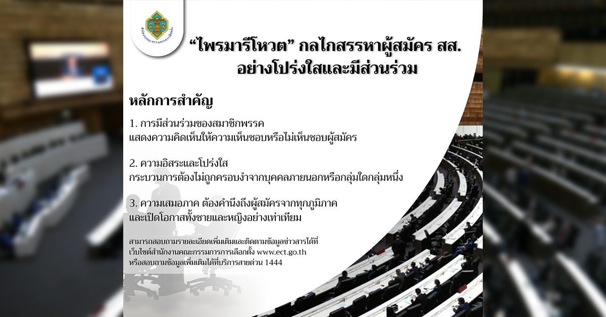 สำนักงาน กกต.เผยแพร่เอกสารให้ความรู้แก่พรรคการเมืองและประชาชน เกี่ยวกับการจัดทำ “ไพรมารี โหวต” หรือการเลือกตั้งขั้นต้น โดยเป็นกระบวนการสรรหาผู้สมัครรับเลือกตั้งสมาชิกสภาผู้แทนราษฎรตามพระราชบัญญัติประกอบรัฐธรรมนูญว่าด้วยพรรคการเมือง 2560 แก้ไขเพิ่มเติม (ฉบับที่ 2) 2566 ซึ่งการทำไพรมารีโหวต เป็นการเปิดโอกาสให้สมาชิกพรรคการเมืองได้มีส่วนร่วมในการแสดงความคิดเห็น ให้ความเห็นชอบหรือไม่เห็นชอบกับผู้สมัครที่จะลงสมัครในนามของพรรค มีหลักการสำคัญคือ การมีส่วนร่วมของสมาชิกพรรค ความอิสระและโปร่งใส กระบวนการจัดทำต้องไม่ถูกครอบงำจากบุคคลภายนอกหรือกลุ่มใดกลุ่มหนึ่ง และความเสมอภาค ต้องคำนึงถึงผู้สมัครจากทุกภาคและเปิดโอกาสทั้งชายได้หญิงอย่างเท่าเทียมกัน