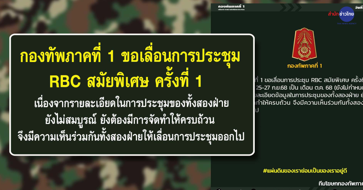 เพจเฟซบุ๊กกองทัพภาคที่ 1 โพสต์ข้อความว่า กองทัพภาคที่ 1 ขอเลื่อนการประชุม RBC สมัยพิเศษ ครั้งที่ 1 ด้าน ทภ.1 และ ภท.5 ในห้วง 25-27 กันยายน เป็นเดือนตุลาคม แต่ยังไม่ได้กำหนดวัน เนื่องจากรายละเอียดในการประชุมของทั้งสองฝ่ายยังไม่สมบูรณ์ ยังต้องมีการจัดทำให้ครบถ้วน จึงมีความเห็นร่วมกันทั้งสองฝ่ายให้เลื่อนการประชุมออกไป
