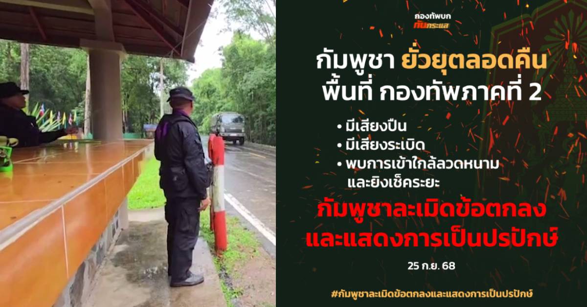 25 ก.ย. – กัมพูชายังไม่เลิกยั่วยุ ชายแดนตึงเครียดตลอดคืน หลังพบการยิงปืนและระเบิดในพื้นที่กองทัพภาคที่ 2 ด้าน รมว.ต่างประเทศ เตรียมบินด่วนแจงเวที UNGA เย็นนี้
