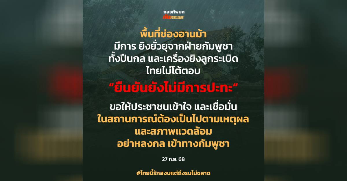 เมื่อเวลา 12.30 น. วันที่ 27 ก.ค.68 รายงานข่าวเปิดเผยว่า จากกรณีที่มีเหตุทหารกัมพูชาได้ใช้อาวุธปืนกลมือพร้อมยิงลูกระเบิด ยิงเข้ามายังฝั่งไทยในช่วงเวลา 12.03 น. ทำให้เจ้าหน้าที่ทหารฝ่ายไทยจำเป็นต้องตอบโต้กลับไปด้วยอาวุธขนาดเดียวกัน นั้น