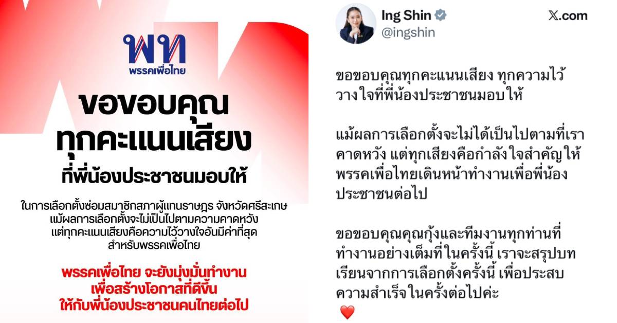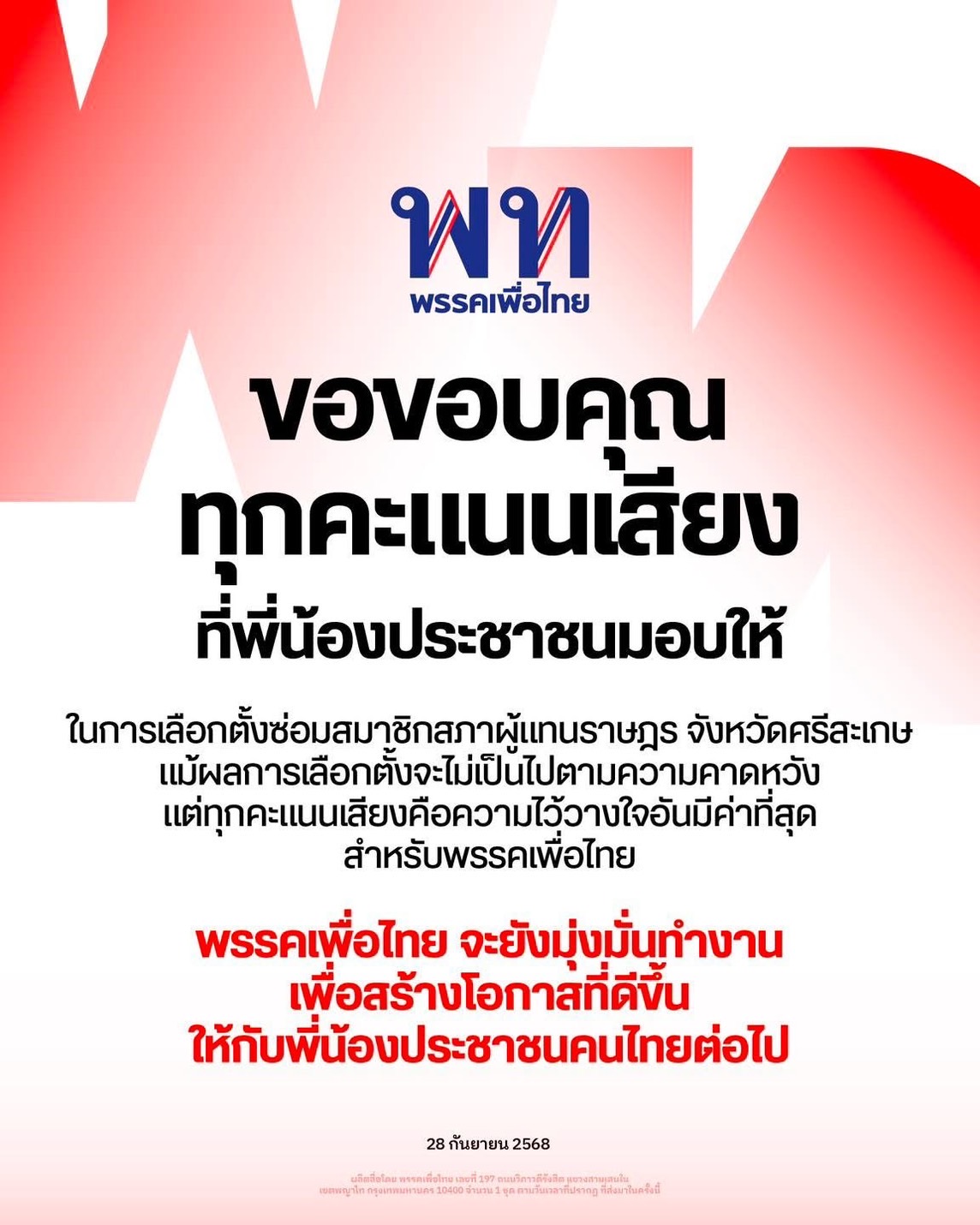 โดยพรรคเพื่อไทย ระบุว่า ขอขอบคุณทุกคะแนนเสียงที่พี่น้องประชาชนมอบให้ ในการเลือกตั้งซ่อมสมาชิกสภาผู้แทนราษฎร จังหวัดศรีสะเกษ แม้ผลการเลือกตั้งจะไม่เป็นไปตามความคาดหวัง แต่ทุกคะแนนเสียงคือความไว้วางใจ อันมีค่าที่สุดสำหรับพรรคเพื่อไทย พรรคเพื่อไทยจะยังมุ่งมั่นทำงานเพื่อสร้างโอกาสที่ดีขึ้นให้กับพี่น้องประชาชนคนไทยต่อไป