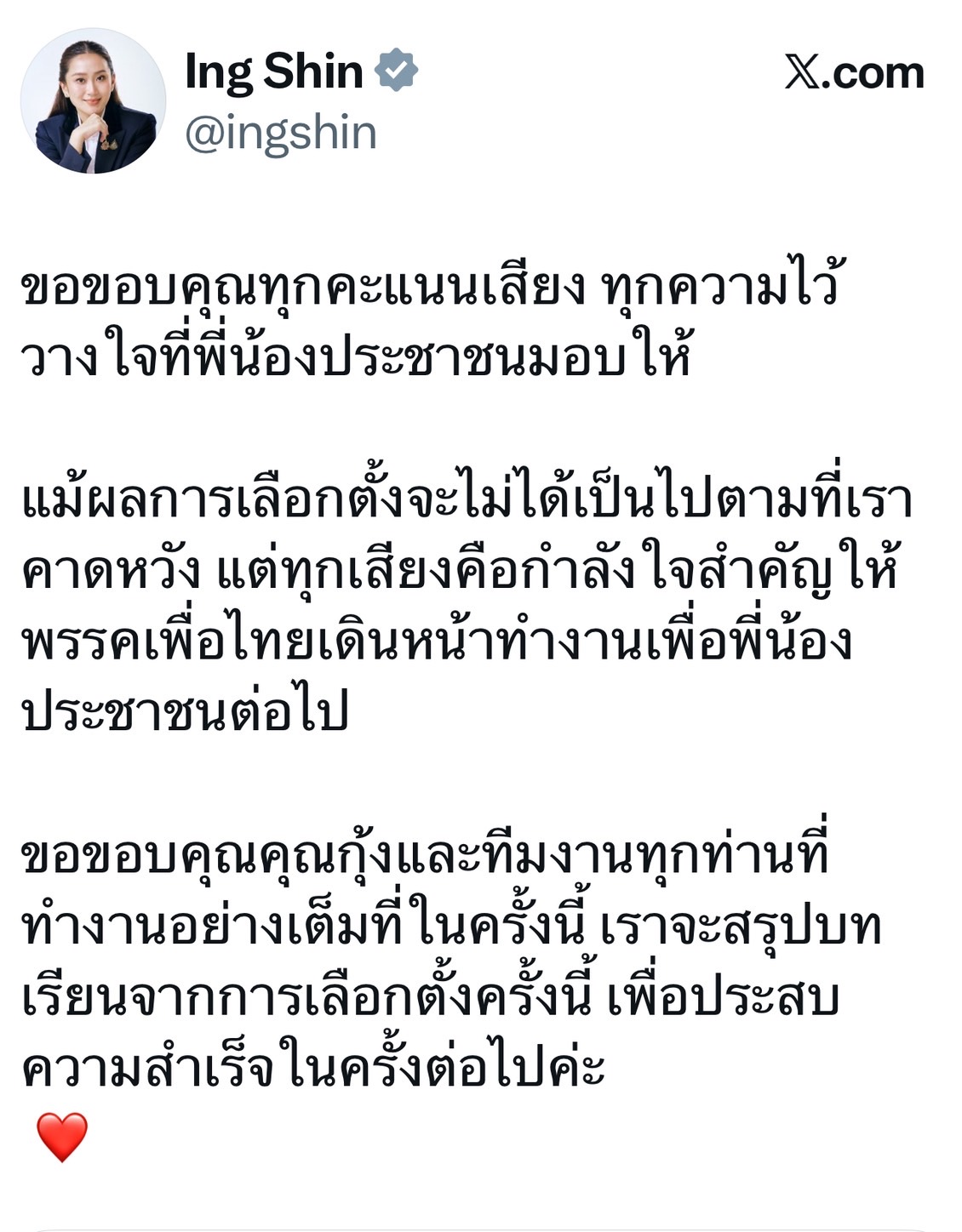 “ขอขอบคุณคุณกุ้งและทีมงานทุกท่านที่ทำงานอย่างเต็มที่ในครั้งนี้ เราจะสรุปบทเรียนจากการเลือกตั้งครั้งนี้ เพื่อประสบความสำเร็จในครั้งต่อไปค่ะ” น.ส.แพทองธาร ระบุ.-316-สำนักข่าวไทย