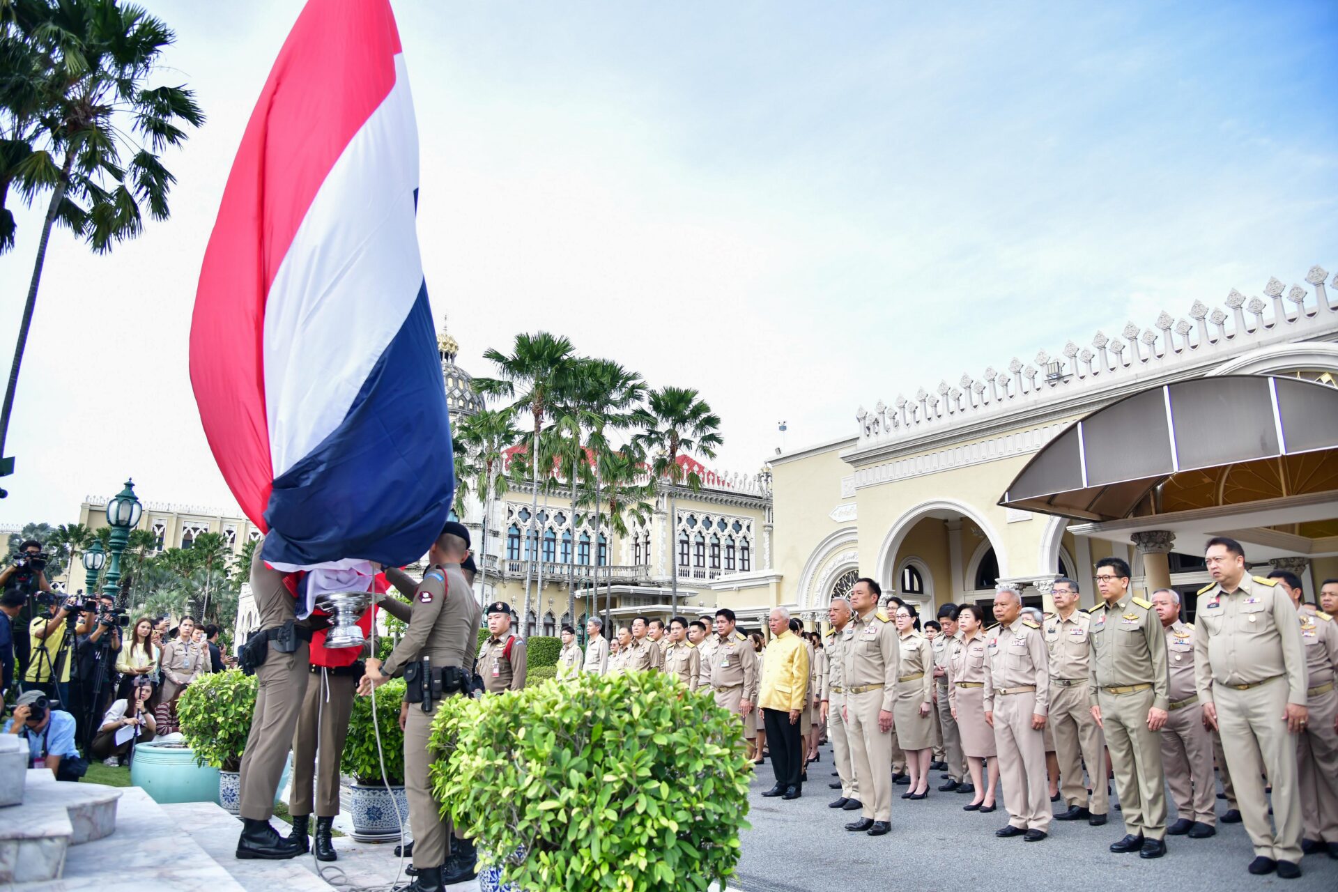 นายอนุทิน ชาญวีรกูล นายกรัฐมนตรีและรัฐมนตรีว่าการกระทรวงมหาดไทย นำคณtรัฐมนตรี ประกอบด้วยนายพิพัฒน์ รัชกิจประการ รองนายกรัฐมนตรีและรัฐมนตรีว่าการกระทรวงคมนาคม นายโสภณ ซารัมย์ รองนายกรัฐมนตรี นายบวรศักดิ์ อุวรรณโณ รองนายกรัฐมนตรี นายเอกนิติ นิติทัณฑ์ประภาศ รองนายกรัฐมนตรี และรัฐมนตรีว่าการกระทรวงการคลัง ร้อยเอก ธรรมนัส พรหมเผ่า รองนายกรัฐมนตรี และรัฐมนตรีเกษตรฯ นายสุชาติ ชมกลิ่น รองนายกรัฐมนตรี และรัฐมนตรีว่าการกระทรวงทรัพย์ฯ รวมถึง 4 รัฐมนตรีประจำสำนักนายกรัฐมนตรี ทั้ง 4 คน คือ นางสาวศุภมาศ อิศรภักดี นายภราดร ปริศนานันทกุล นายนภินทร ศรีสรรพางค์ และนายสันติ ปิยะทัต ผู้บริหาร และเจ้าหน้าที่ เคารพธงชาติและร้องเพลงชาติไทย เนื่องในวันพระราชทานธงชาติไทย ณ บริเวณเสาธง หน้าตึกสันติไมตรี ทำเนียบรัฐบาล เพื่อน้อมรำลึกถึงพระมหากรุณาธิคุณของพระบาทสมเด็จพระมงกุฎเกล้าเจ้าอยู่หัว รัชกาลที่ 6 ที่ทรงพระราชทานธงไตรรงค์ให้เป็น “ธงชาติไทย”