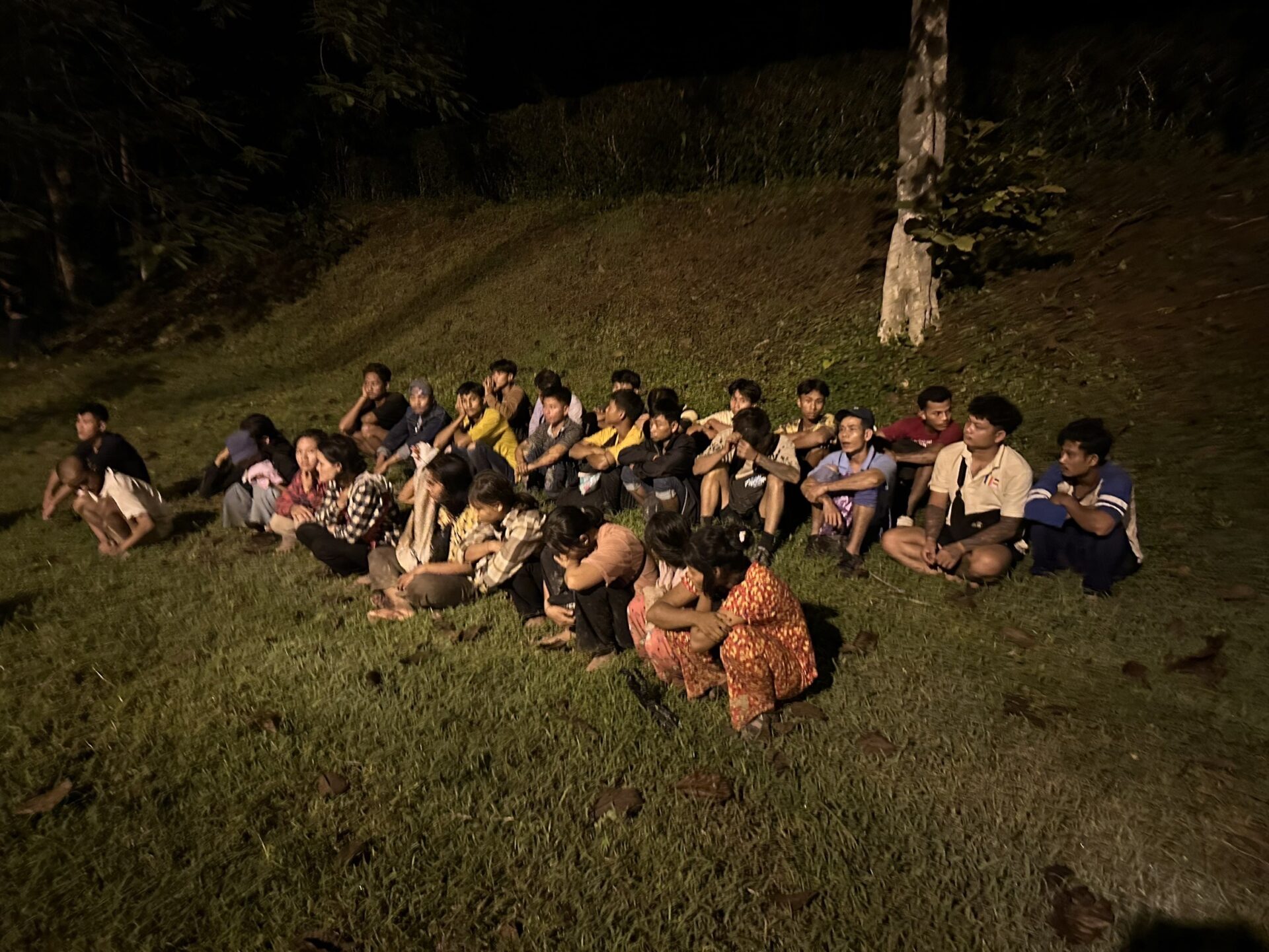 ต่อมาเวลา 02.00 น. ขณะที่เจ้าหน้าที่ฝ่ายความมั่นคงร่วมกันตั้งจุดตรวจจุดสกัด บริเวณ จุดตรวจร่วมหน้าเขื่อนวชิราลงกรณ ต.ท่าขนุน อ.ทองผาภูมิ จ.กาญจนบุรี สังเกตพบรถยนต์ต้องสงสัย ขับมาจาก ต.ห้วยเขย่ง อ.ทองผาภูมิ มุ่งหน้า อ.เมืองกาญจนบุรี จึงได้ให้สัญญาณหยุดรถเพื่อทำการตรวจสอบ แต่ผู้ขับขี่ได้เร่งเครื่องยนต์หลบหนี เจ้าหน้าที่จึงได้เร่งติดตามอย่างกระชั้นชิด กระทั่งสามารถสกัดจับรถยนต์คันดังกล่าวได้ที่ บริเวณ ทางหลวงหมายเลข 3272 ใกล้เคียงกับกองบังคับการหน่วยเฉพาะกิจลาดหญ้า ม.1 ต.ท่าขนุน อ.ทองผาภูมิ จ.กาญจนบุรี ต่อมาเจ้าหน้าที่จึงได้ทำการตรวจสอบอย่างละเอียด พบ รถยนต์ 7 ที่นั่ง หมายเลขทะเบียน กร 1780 กาญจนบุรี ซึ่งผู้ขับขี่ได้ทิ้งรถยนต์คันดังกล่าวไว้ริมถนนและหลบหนีไป ภายในรถยนต์พบบุคคลต่างด้าวผิดกฎหมาย สัญชาติเมียนมา จำนวน 28 คน (ชาย 19 คน และหญิง 9 คน) ซึ่งทั้งหมดไม่สามารถสื่อสารภาษาไทย และไม่มีเอกสารประจำตัวที่ทางราชการออกให้ เจ้าหน้าที่จึงได้ควบคุมตัวไว้ทั้งหมด